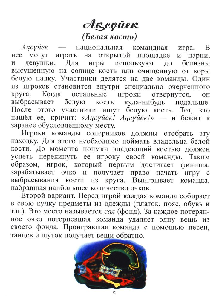 Алтыбақан (казахские национальные игры)В данный момент этот товар отсутствует в продаже. Возможно, у нас найдется аналогичный или похожий товар здесь. Серия: Сен білесің бе? - 3 Тоғыз қүмалақ - увлекательная игра, основанная на логическом мышлении и расчете. Играющие могут в любом месте начертить доску и сделать лунки, собрать құмалақ (можно маленькие камешки). |