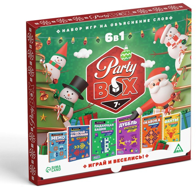 Играйте и веселитесь вместе с Party Box. В этой коробке вас ждёт 6 новогодних мини-версий популярных игр. Они помогут натренировать скорость реакции, ловкость рук, память, внимание и многое другое. А ещё позволят хорошенько повеселиться в кругу друзей и семьи.