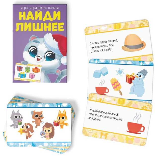 • «Найди лишнее» — ищите лишние предметы или персонажей на карточках. С помощью этой игры ребёнок научится группировать предметы по общему признаку;