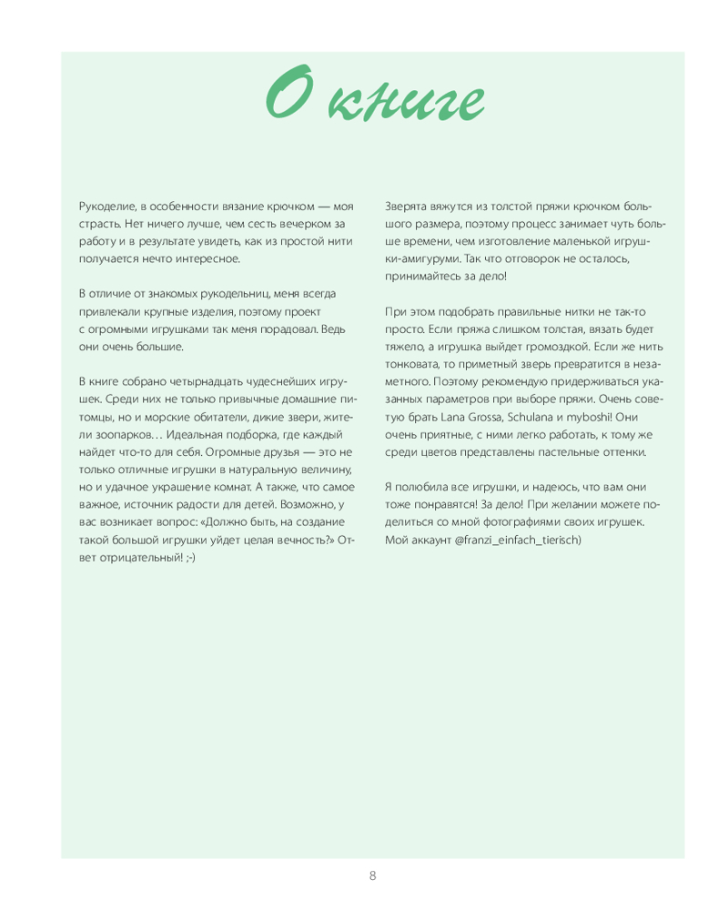 💳 Оплатить за товар можно при получении 🇰🇿 Есть бесплатная доставка по Казахстану от 1 дня 🎁 Копите бонусы с каждой покупки Серия: Популярная энциклопедия современного рукоделия Уникальная новинка — ГИГАНТСКИЕ вязаные амигуруми крючком! Мягкая игрушка, настолько огромная, что ее едва можно обхватить руками, — несбыточная детская мечта. Воплотите ее своими руками! Поселите у себя дома веселую компанию невероятно обаятельных животных, с которыми не захочется расставаться: милую медведицу, забавного жирафа, неуклюжего пингвина, осьминога, любящего жаркие объятия, и их друзей. Все игрушки в книге вяжутся из толстой пряжи, и на их создание уходит совсем не много времени. Неважно, имеете вы опыт в вязании или впервые взяли в руки крючок. Понятные описания процесса вязания помогут вам создать игрушку вашей мечты! Огромные вязаные игрушки покорят вас своей харизмой и приживутся не только в детской, но и на диване вашей гостиной! |