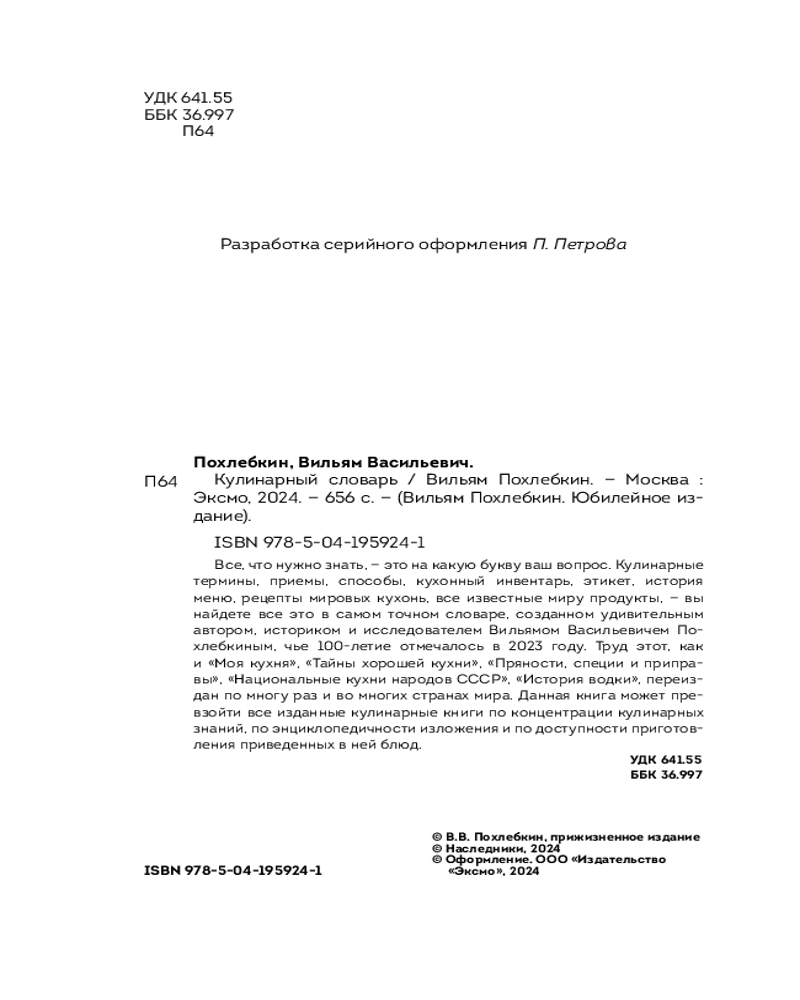 💳 Оплатить за товар можно при получении 🇰🇿 Есть бесплатная доставка по Казахстану 🎁 Копите бонусы с каждой покупки Серия: Вильям Похлебкин. Юбилейное издание Общий тираж выпущенных во всем мире книг Вильяма Васильевича Похлебкина приближается к 100 млн экземпляров! Иметь его книги дома — долг чести для каждого настоящего кулинара. Данное издание — продолжение юбилейной серии, появившейся на свет в год 100-летия со дня рождения этого великого человека, писавшего в непростые 70-е, 80-е и 90-е годы ХХ столетия. В этом кулинарном словаре от А до Я вы найдет любые продукты, термины, методы обработки, инвентарь, названия и рецепты блюд мировой кухни и многое другое. Эта книга станет для вас настоящим помощником, преданным и верным в нашем многообразном и непостоянном мире еды. |