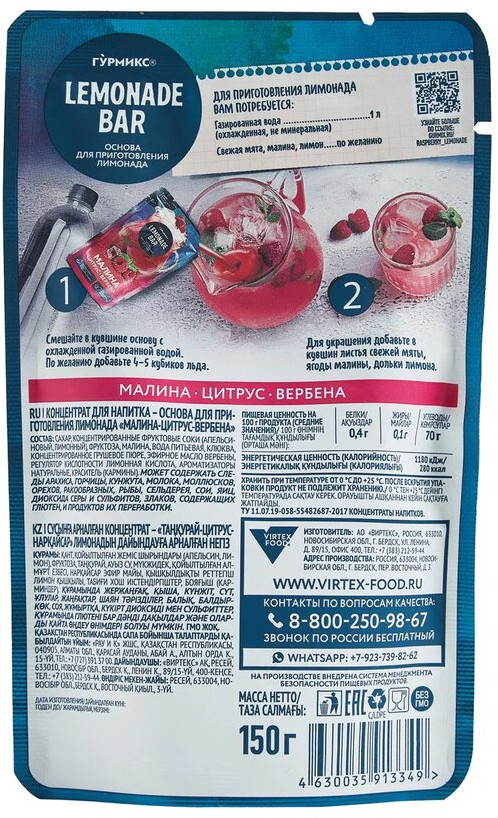 Гурмикс Основа для приготовления лимонада «Малина, цитрус и вербена»
