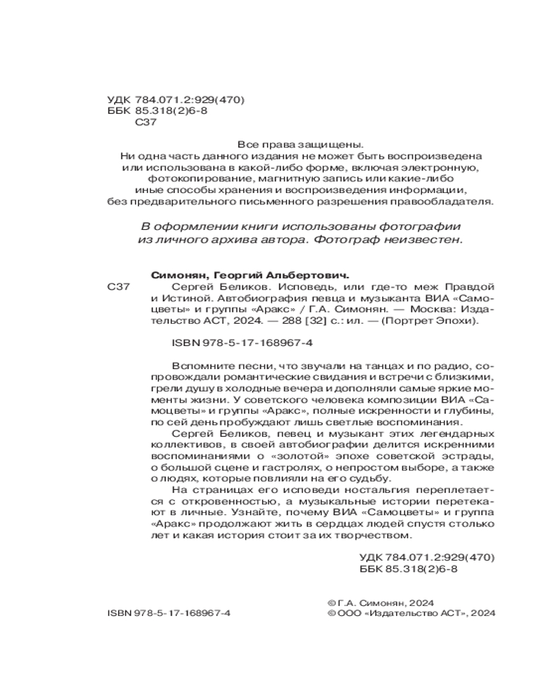 Серия: Портрет эпохи Вспомните песни, что звучали на танцах и по радио, сопровождали романтические свидания и встречи с близкими, грели душу в холодные вечера и дополняли самые яркие моменты жизни. У советского человека композиции ВИА «Самоцветы» и группы «Аракс», полные искренности и глубины, по сей день пробуждают лишь светлые воспоминания. Сергей Беликов, певец и музыкант этих легендарных коллективов, в своей автобиографии делится искренними воспоминаниями о «золотой» эпохе советской эстрады, о большой сцене и гастролях, о непростом выборе, а также о людях, которые повлияли на его судьбу.   |