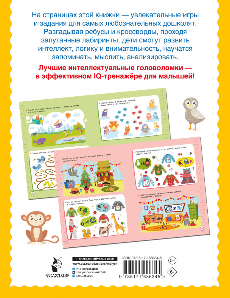 💳 Оплатить за товар можно при получении 🇰🇿 Есть бесплатная доставка по Казахстану от 1 дня 🎁 Копите бонусы с каждой покупки Серия: 500 заданий для малышей «500 увлекательных IQ-заданий для дошколят. 5-7 лет» — это большой сборник увлекательных заданий: ребусов, кроссвордов, игр с буквами и словами, задачек на логику и сообразительность. Интересные головоломки на любой вкус помогут ребёнку развить интеллект и внимание, зрительное восприятие и мелкую моторику, пополнить словарный запас, проявить творческие способности. Для дошкольного возраста. |