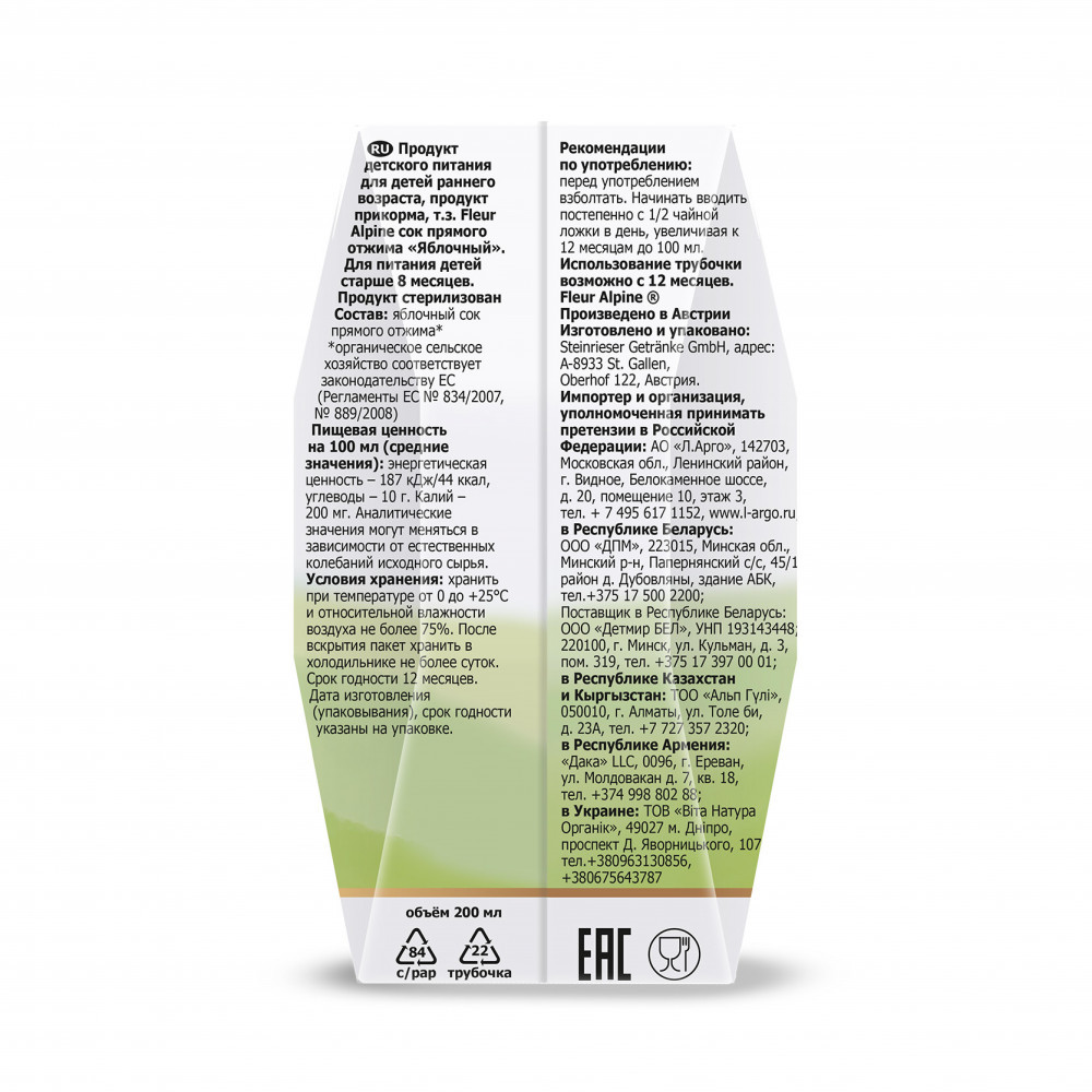 Fleur Alpine Сок прямого отжима «Яблоко»-25% +8