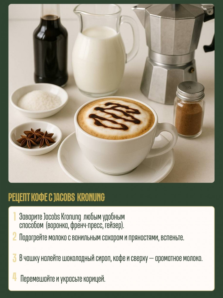 Кофе Jacobs Kronung — превосходный купаж отборной арабики. Этот напиток выделяется богатым ароматом, секрет которого таится в традиционной технологии обработки кофейных зерен.