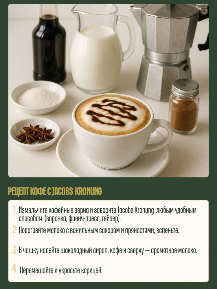Кофе Jacobs Kronung — превосходный купаж отборной арабики. Этот напиток выделяется богатым ароматом, секрет которого таится в традиционной технологии обработки кофейных зерен.