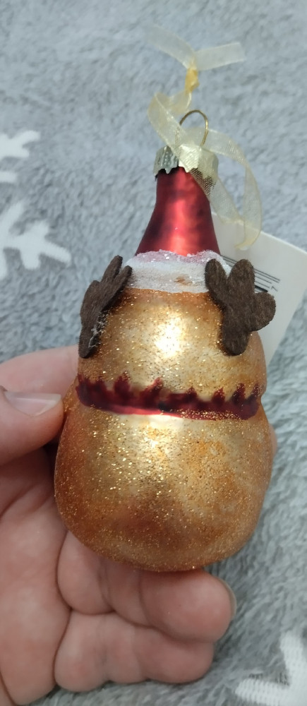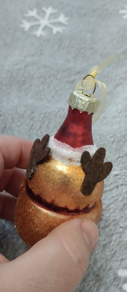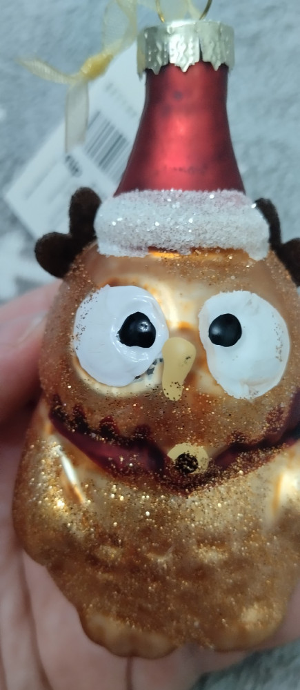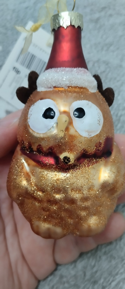красивая небольшая совушка, светло коричневая, немного осыпается блеск, рожки из фетра приклеены клеем не очень аккуратно - сама подчищала. На ёлке смотрится красиво. Главный недостаток - нет упаковочной коробки, пришла просто в пупырке.