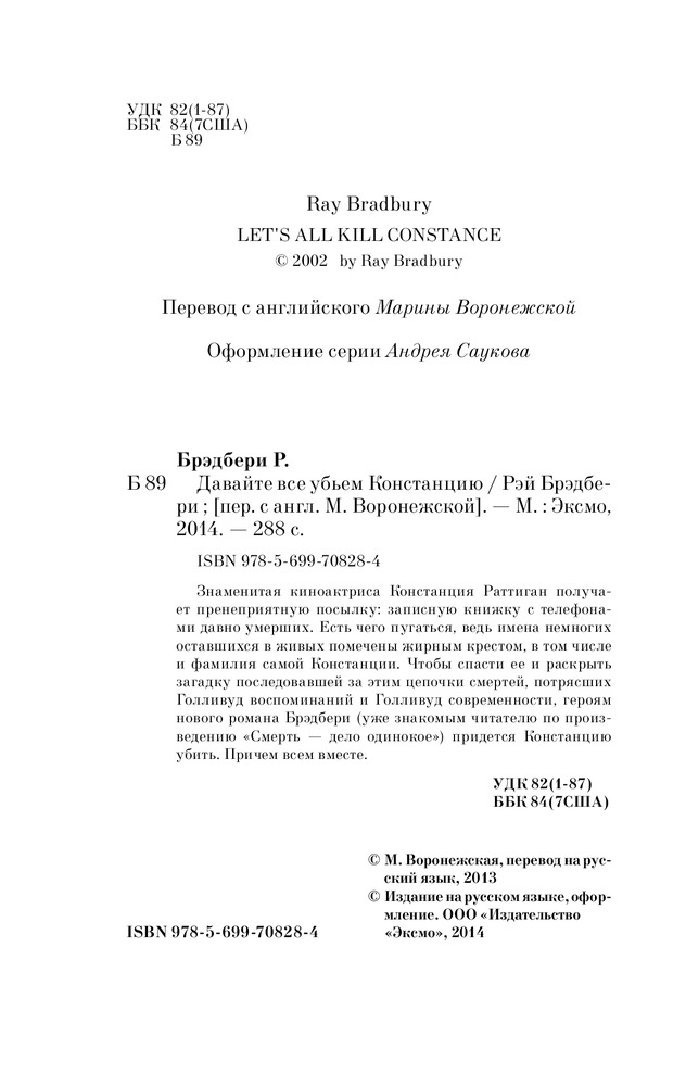 💳 Оплатить за товар можно при получении 🇰🇿 Есть бесплатная доставка по Казахстану 🎁 Копите бонусы с каждой покупки Серия: Pocket Book (обложка) Знаменитая киноактриса Констанция Раттиган получает пренеприятную посылку: записную книжку с телефонами давно умерших. Есть, чему пугаться, ведь имена немногих оставшихся в живых помечены жирным крестом, в том числе и фамилия самой Констанции. |
