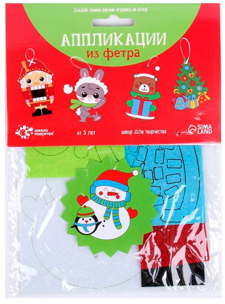 Арт Узор Набор для творчества «Снеговик»В данный момент этот товар отсутствует в продаже. Возможно, у нас найдется аналогичный или похожий товар здесь. Этот набор позволяет собрать украшение из фетра на елку «Снеговик», не используя нитку и иглу. Лента для подвеса также входит в комплект. Дополнительно понадобится только текстильный клей. Фетр — прекрасный материал для творчества, он окрашен в яркие цвета, не осыпается и хорошо держит форму. Мягкая фактура фетра с небольшим ворсом создает впечатление уюта и удачно вписывается в новогоднюю атмосферу. Аккуратно склейте детали будущей игрушки, ориентируясь по рисунку, привяжите атласную ленту, и яркое украшение на елку готово! |