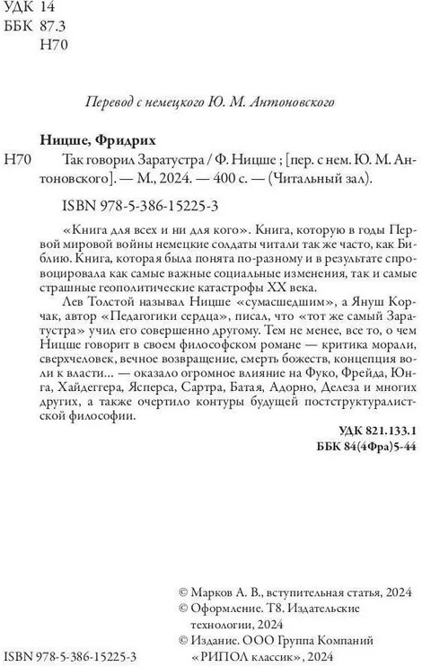 💳 Оплатить за товар можно при получении 🇰🇿 Есть бесплатная доставка по Казахстану от 1 дня 🎁 Копите бонусы с каждой покупки Серия: Читальный зал «Книга для всех и ни для кого». Книга, которую в годы Первой мировой войны немецкие солдаты читали так же часто, как Библию. Книга, которая была понята по-разному и в результате спровоцировала как самые важные социальные изменения, так и самые страшные геополитические катастрофы XX века. Лев Толстой называл Ницше «сумасшедшим», а Януш Корчак, автор «Педагогики сердца», писал, что «тот же самый Заратустра» учил его совершенно другому. Тем не менее, все то, о чем Ницше говорит в своем философском романе — критика морали, сверхчеловек, вечное возвращение, смерть божеств, концепция воли к власти... — оказало огромное влияние на Фуко, Фрейда, Юнга, Хайдеггера, Ясперса, Сартра, Батая, Адорно, Делеза и многих других, а также очертило контуры будущей постструктуралистской философии. |