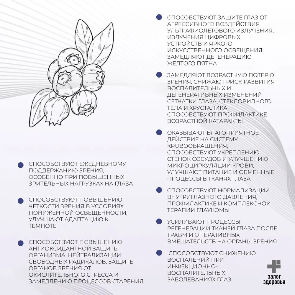 Способствует ежедневному поддержанию зрения, особенно при повышенных зрительных нагрузках на глаза (управление автомобилем, работа за компьютером, чтение), снижает усталость и напряжение глаз. Способствует повышению четкости зрения в условиях пониженной освещенности, улучшает адаптацию к темноте. Способствует повышению антиоксидантной защиты организма, нейтрализации свободных радикалов, защите органов зрения от окислительного стресса и замедлению процесса старения. Способствует защите глаз от агрессивного воздействия ультрафиолетового излучения , излучения цифровых устройств и яркого искусственного освещения , замедляют дегенерацию желтого пятна, помогая сохранять острое зрение. Замедляет возрастную потерю зрения, снижает риск развития воспалительных и дегенеративных изменений сетчатки глаза, стекловидного тела и хрусталика, способствует профилактике возрастной катаракты. Оказывает благоприятное действие на систему кровообращения, способствует укреплению стенок сосудов и улучшению микроциркуляции крови, улучшает питание и обменные процессы в тканях глаза. Способствует нормализации внутриглазного давления и профилактике и комплексной терапии глаукомы. Усиливает процессы регенерации тканей глаз после травм и оперативных вмешательств на органы зрения. Способствуют снижению воспалений при инфекционно- воспалительных заболеваниях глаз. Способствует снижению раздражения, покраснения и сухости глаз, применяется при воспалении слизистой оболочки органов зрения.