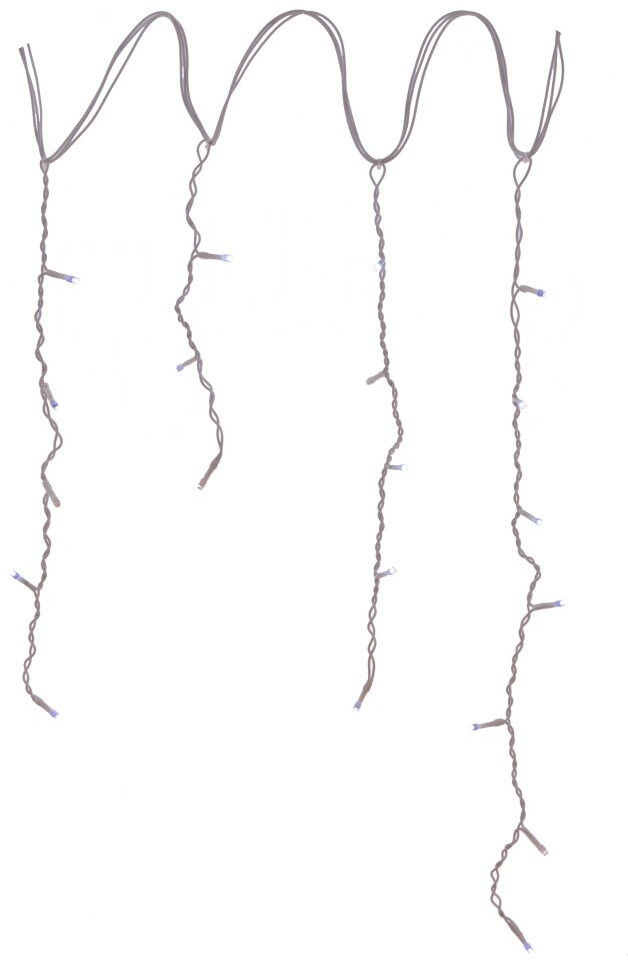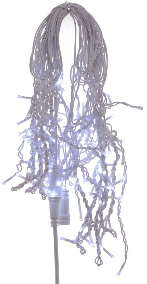 Электрогирлянда «Бахрома» на белом шнуре длиной 12 м состоит из 40 линий бахромы. Содержит 200 светодиодных ламп, расстояние между которыми 7 см. Длина линий бахромы: 28 см, 45 см, 46 см, 63 см. Имеет 1 тип свечения холодным белым светом с проблеском некоторых белых огоньков. Такое свечение смотрится очень нарядно и не навязчиво. Мощность — 7W, напряжение — 220V. Степень защиты IP44 позволяет использовать гирлянду как в помещении, так и на улице. Адаптер длиной 140 см и переходник в комплекте.