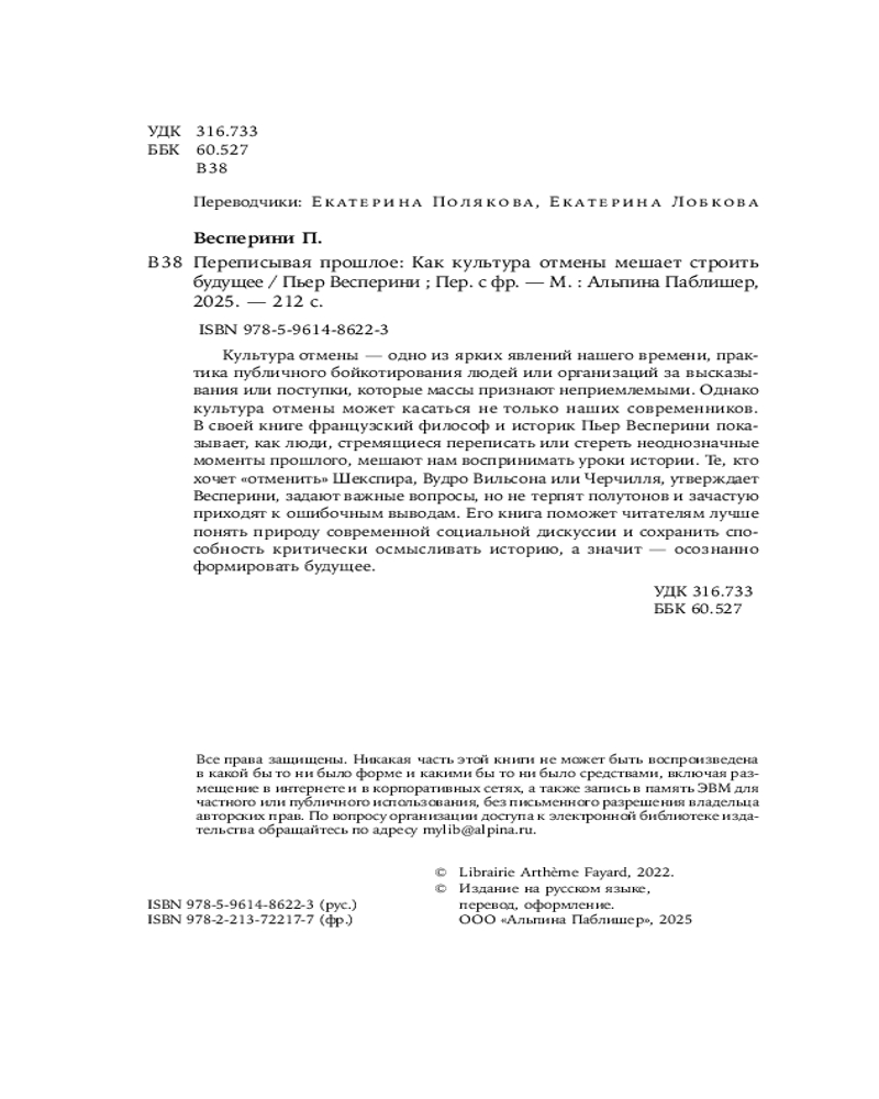 💳 Оплатить за товар можно при получении 🇰🇿 Есть бесплатная доставка по Казахстану от 1 дня 🎁 Копите бонусы с каждой покупки Культура отмены — одно из ярких явлений нашего времени, практика публичного бойкотирования людей или организаций за высказывания или поступки, которые массы признают неприемлемыми. Однако культура отмены может касаться не только наших современников. В своей книге французский философ и историк Пьер Весперини показывает, как люди, стремящиеся переписать или стереть неоднозначные моменты прошлого, мешают нам воспринимать уроки истории. Те, кто хочет «отменить» Шекспира, Вудро Вильсона или Черчилля, утверждает Весперини, задают важные вопросы, но не терпят полутонов и зачастую приходят к ошибочным выводам. Его книга поможет читателям лучше понять природу современной социальной дискуссии и сохранить способность критически осмысливать историю, а значит — осознанно формировать будущее. |
