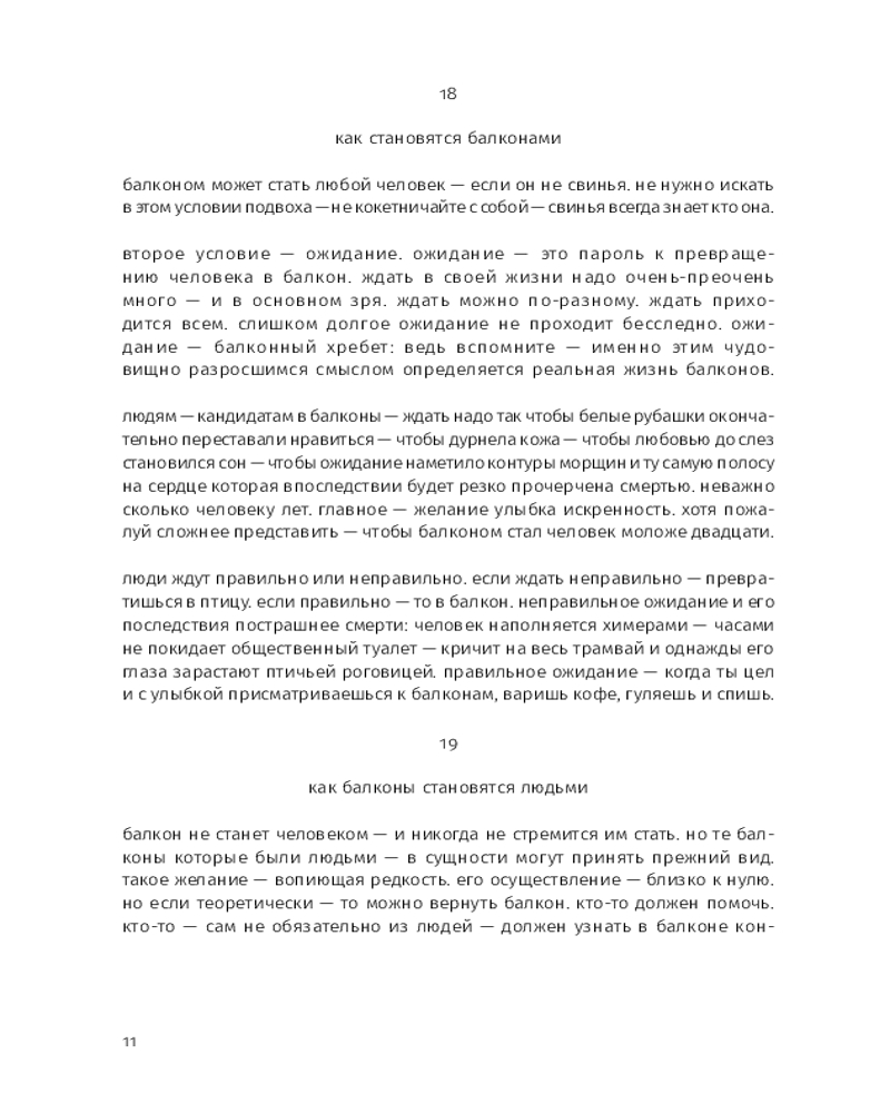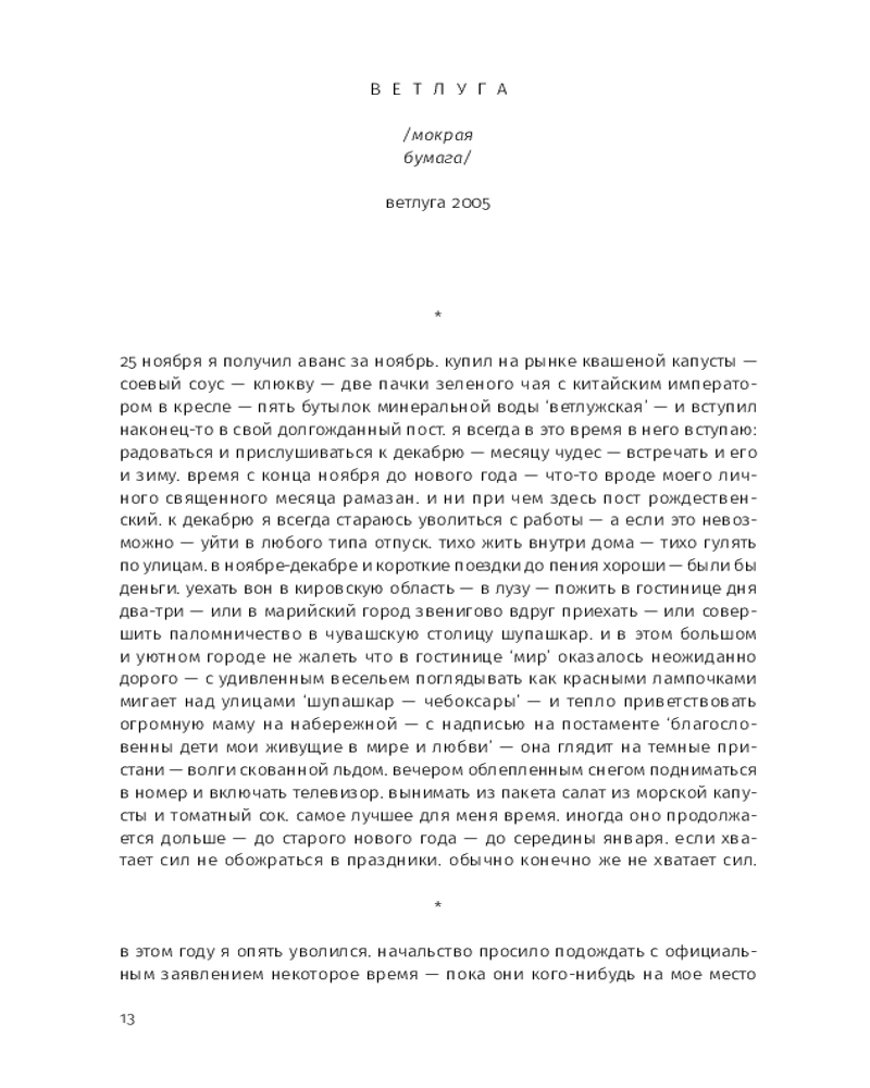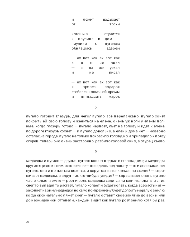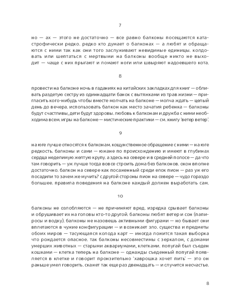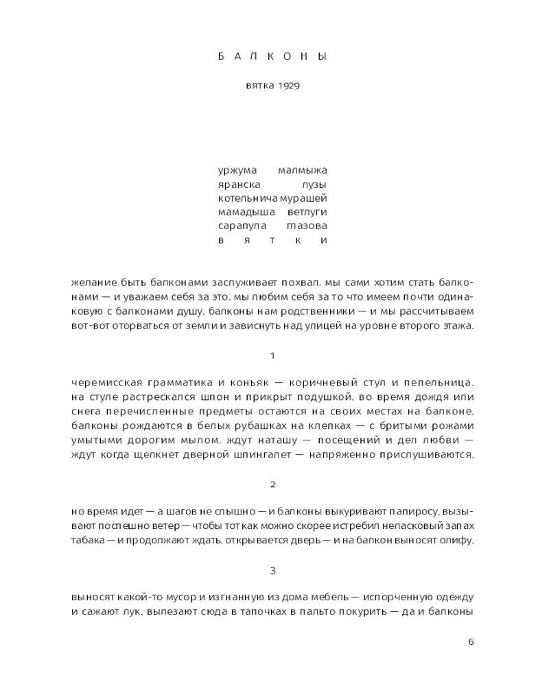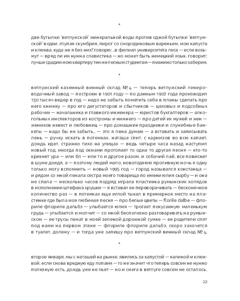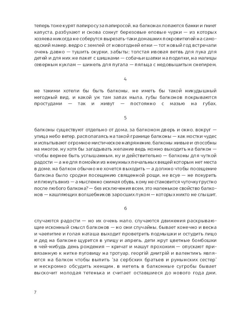 Этой прозе свойственна особая органика, визуальная форма: заглавные буквы здесь отсутствуют, пунктуация упрощена, а текст расположен определенным образом на пространстве страницы — так отсекается лишнее, текст наполняется воздухом и каждое слово становится акцентированным. |