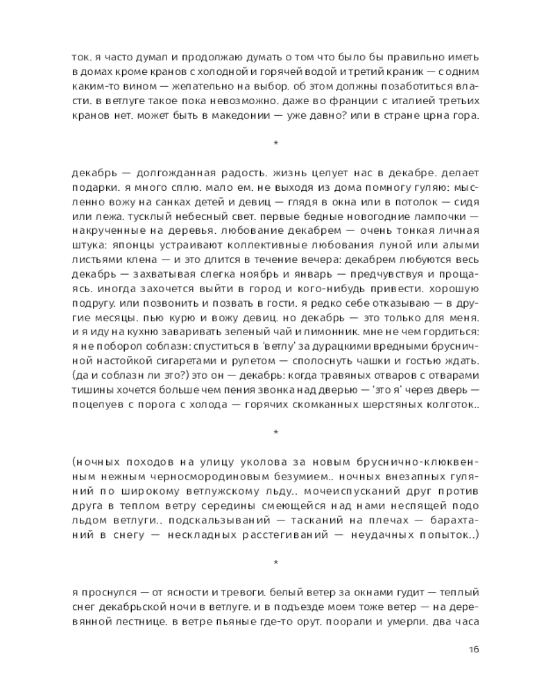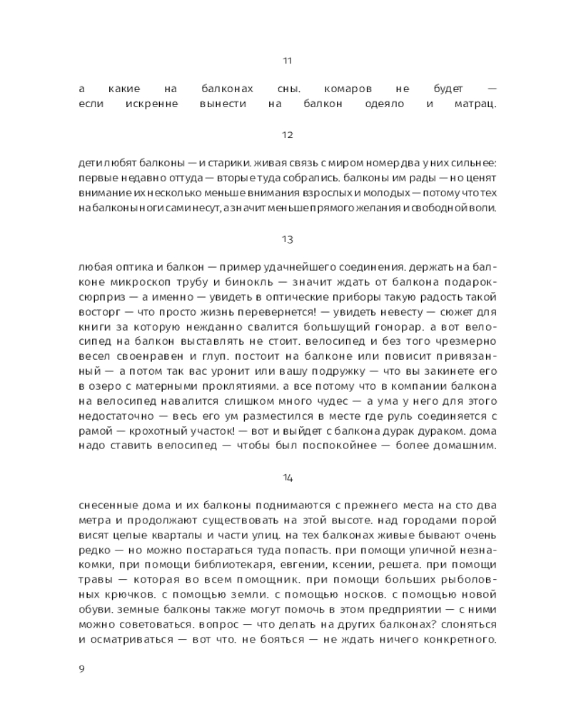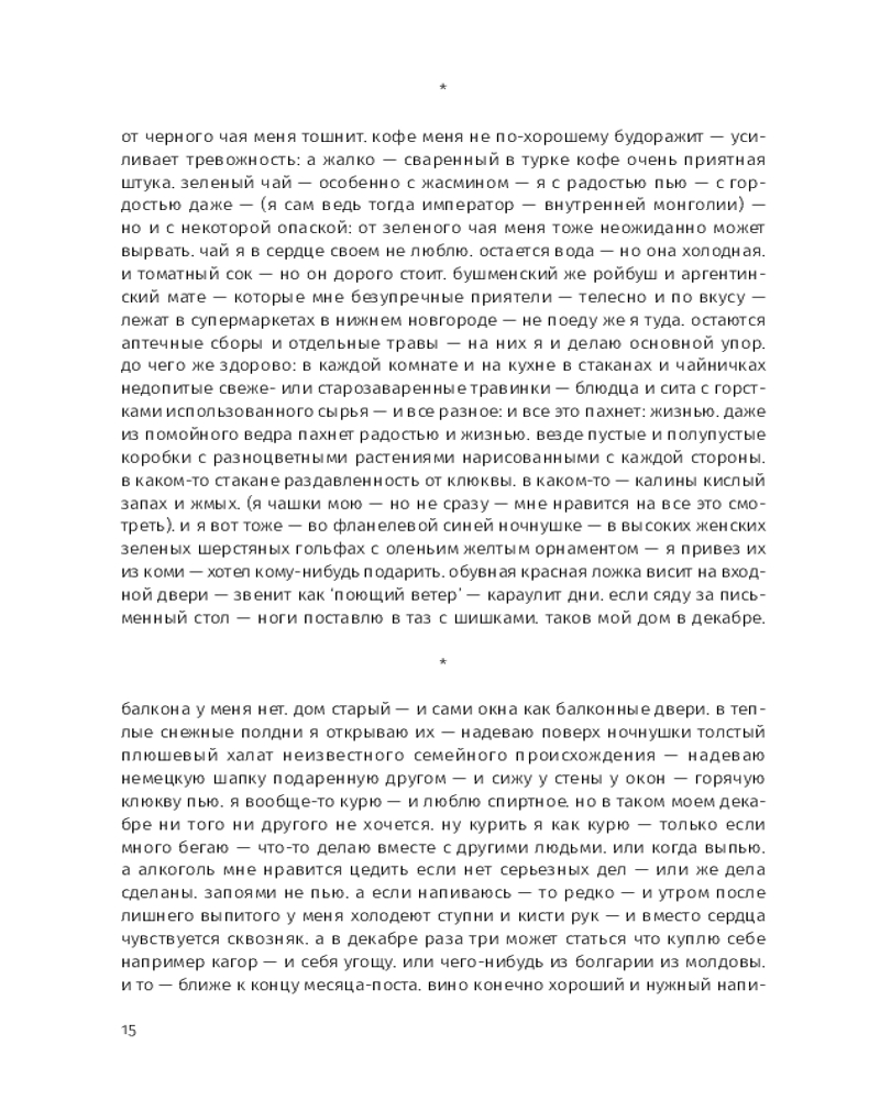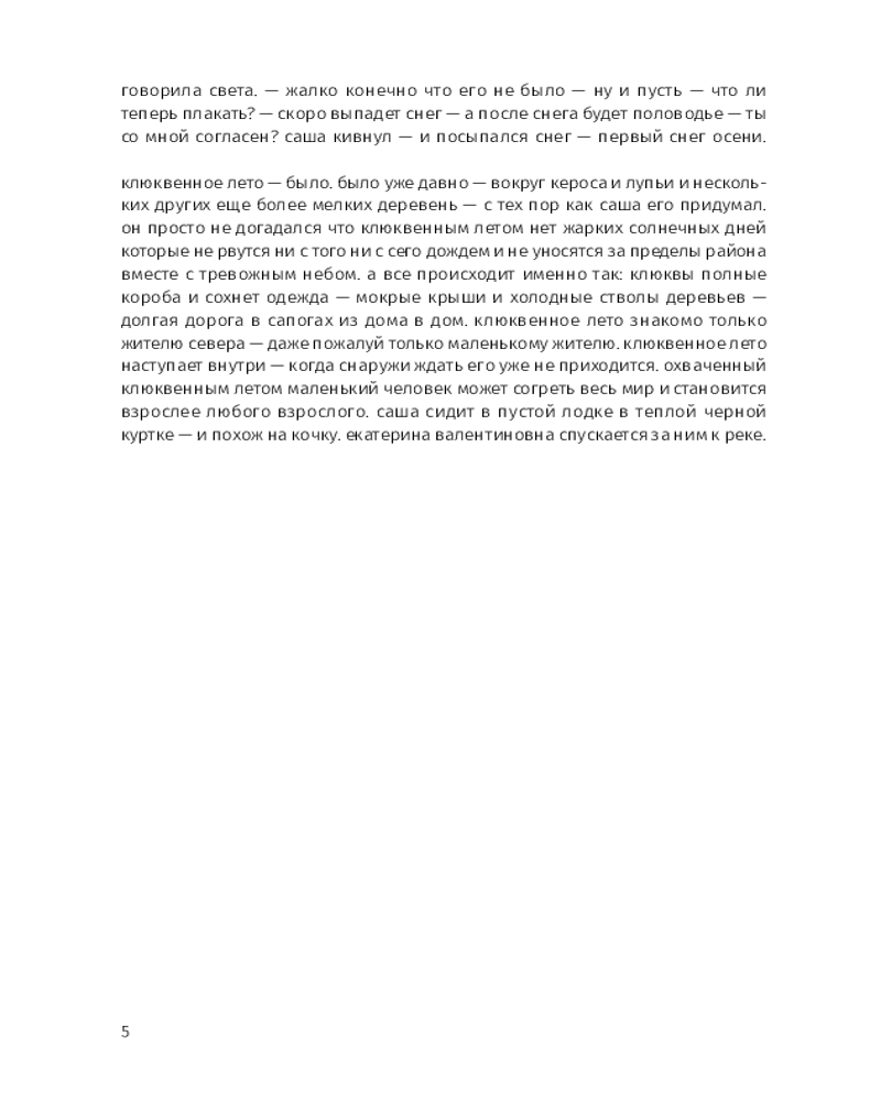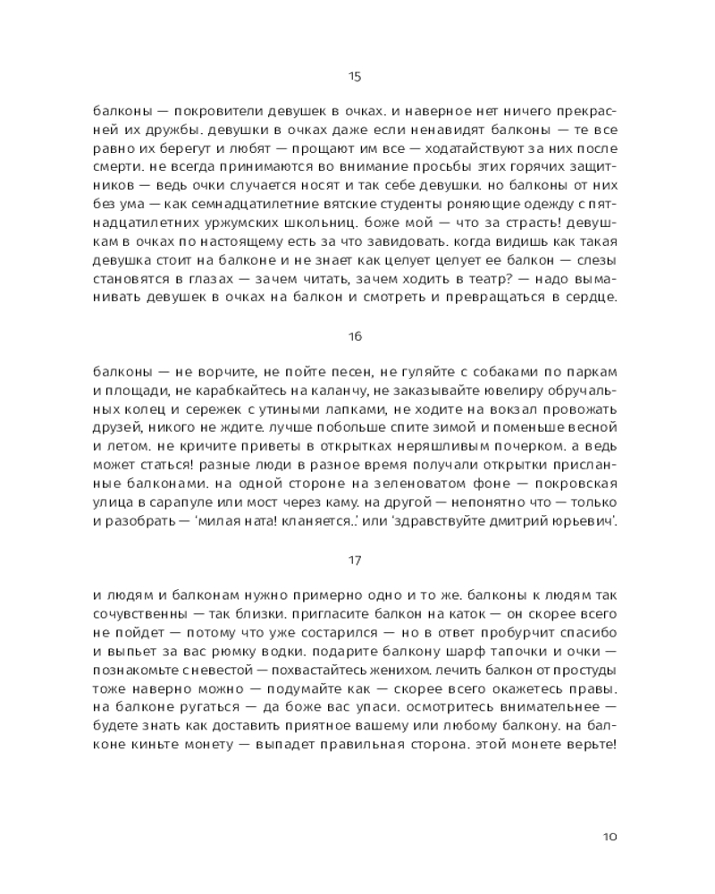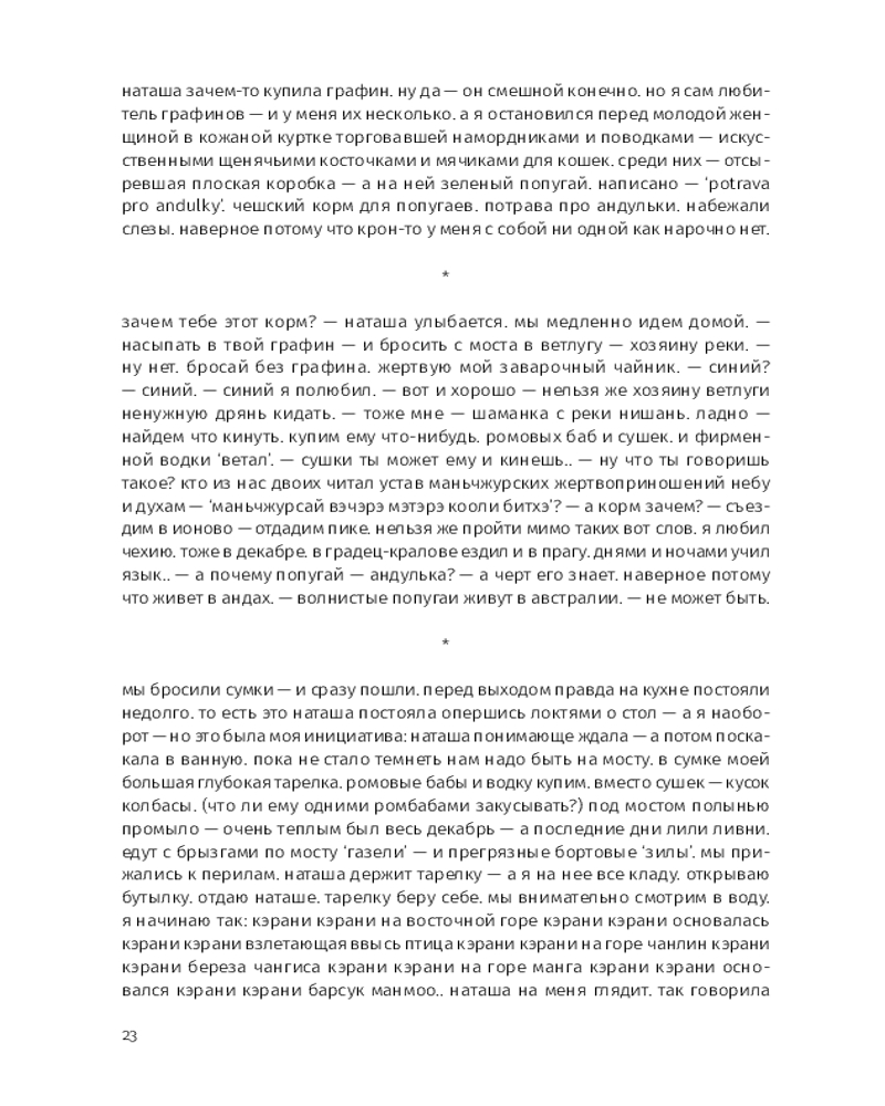 Этой прозе свойственна особая органика, визуальная форма: заглавные буквы здесь отсутствуют, пунктуация упрощена, а текст расположен определенным образом на пространстве страницы — так отсекается лишнее, текст наполняется воздухом и каждое слово становится акцентированным. |