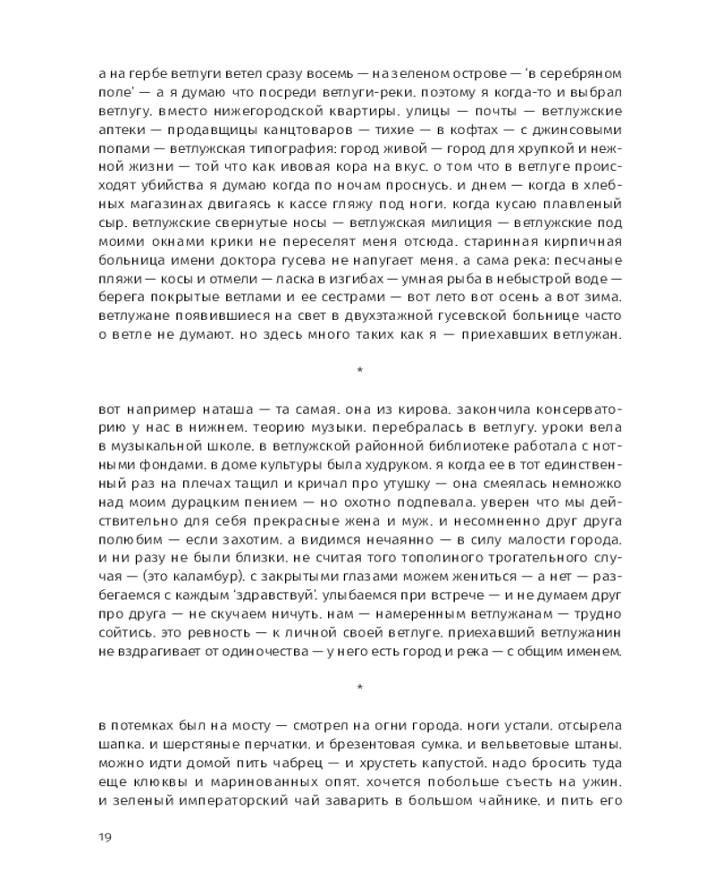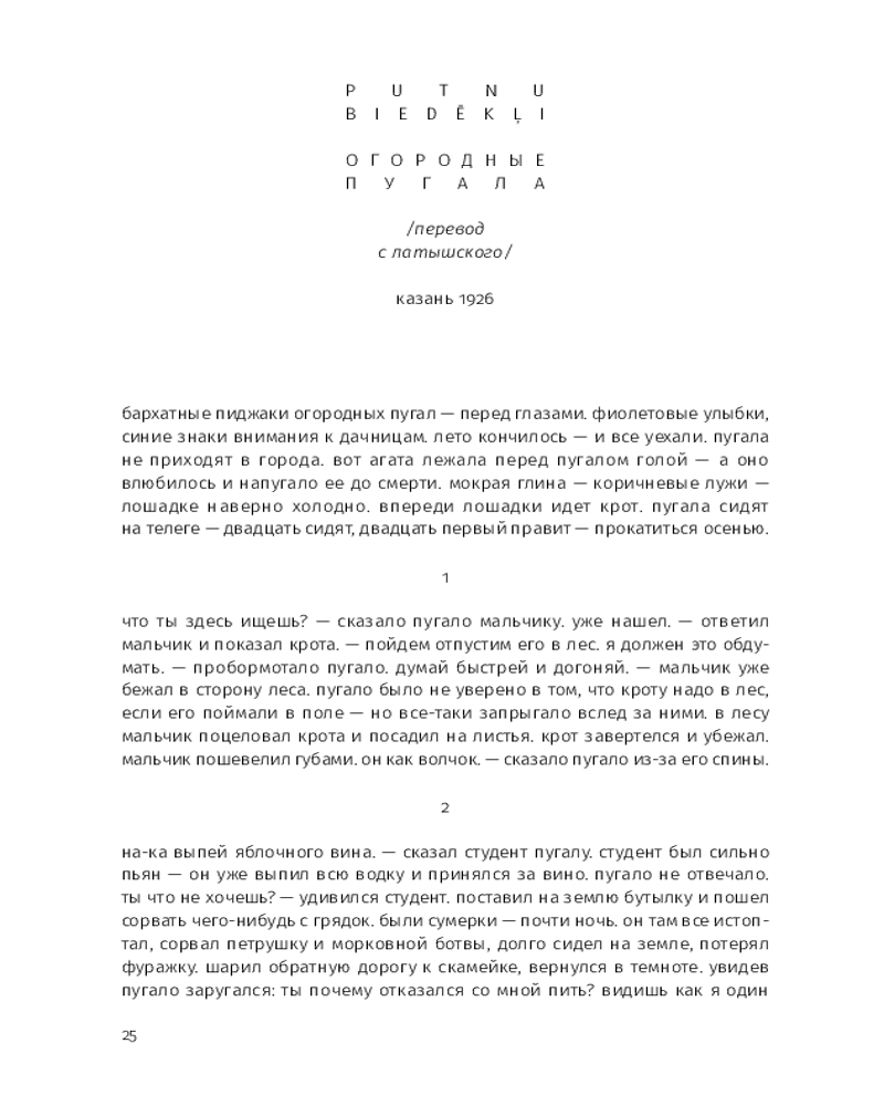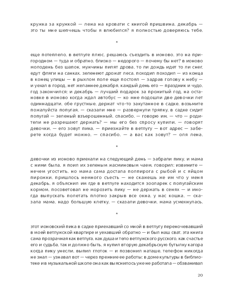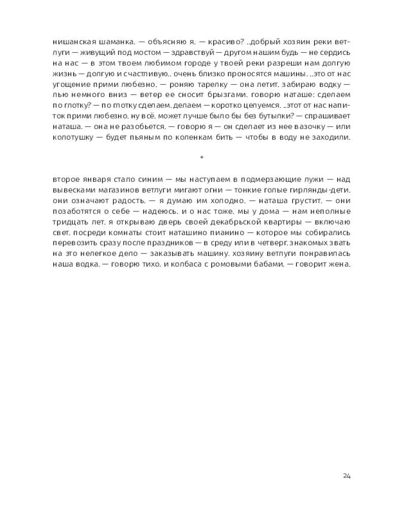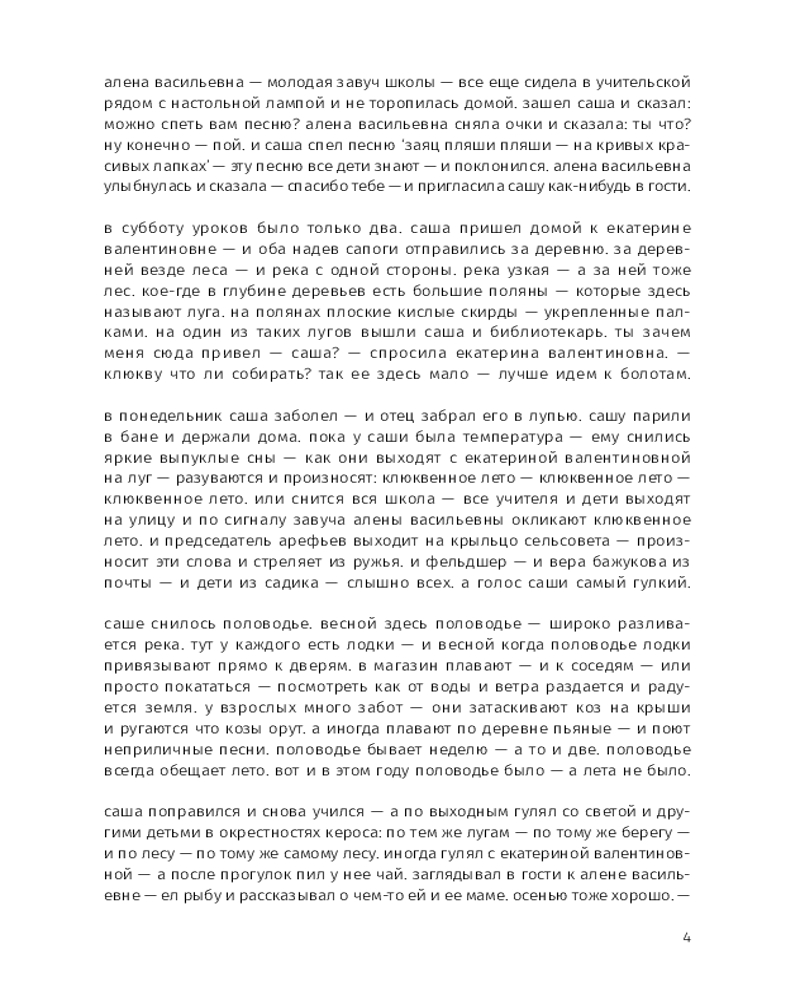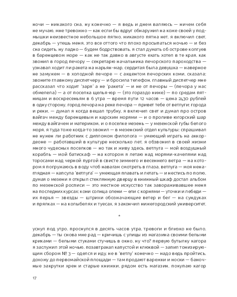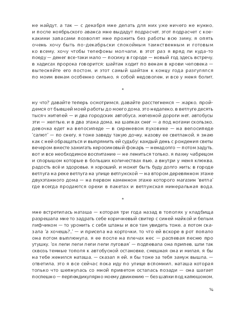 Этой прозе свойственна особая органика, визуальная форма: заглавные буквы здесь отсутствуют, пунктуация упрощена, а текст расположен определенным образом на пространстве страницы — так отсекается лишнее, текст наполняется воздухом и каждое слово становится акцентированным. |
