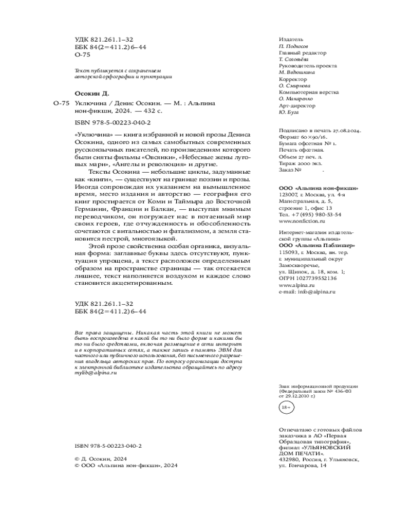 Книга избранной и новой прозы Дениса Осокина, одного из самых самобытных современных русскоязычных писателей, по произведениям которого были сняты фильмы «Овсянки», «Небесные жены луговых мари», «Ангелы и революция» и другие.
