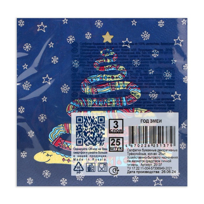 Art Bouquet Набор салфеток бумажных «Год змеи»В данный момент этот товар отсутствует в продаже. Возможно, у нас найдется аналогичный или похожий товар здесь. Салфетки бумажные Bouquet de Luxe «Год змеи» — это стильный и практичный аксессуар для вашей кухни или праздничного стола. Трёхслойные салфетки размером 24×24 см изготовлены из высококачественной целлюлозы, что делает их прочнее. Особенностью этих салфеток является дизайн с изображением змеи, символизирующей наступающий год. Насыщенные цвета придают салфеткам роскошный вид. Bouquet de Luxe «Год змеи» идеально подойдут для любого случая: от уютного семейного ужина до торжественного мероприятия. Они станут прекрасным дополнением к вашему интерьеру. |