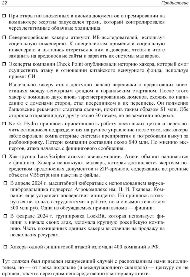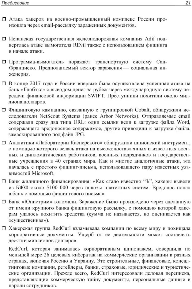 💳 Оплатить за товар можно при получении 🇰🇿 Есть бесплатная доставка по Казахстану от 1 дня 🎁 Копите бонусы с каждой покупки Книга рассматривает используемые современными киберпреступниками методы социальной инженерии и способы защиты от нее — как организационные, так и технические. Приведено 130 практических примеров атак, даны примеры фишинговых писем, раскрыты применяемые мошенниками психологические приемы и трюки, позволяющие вводить пользователей в заблуждение, подробно разобран используемый злоумышленниками программный инструментарий. Описаны различные векторы атак: по электронной почте, в мессенджерах, в социальных сетях и в реальной жизни. Предложена методика создания 10 000 сценариев учебных атак, а также дана пошаговая инструкция их проведения от этапа подготовки до составления отчета. Во втором издании особое внимание уделено использованию в социальной инженерии и фишинге современных технологий искусственного интеллекта. |