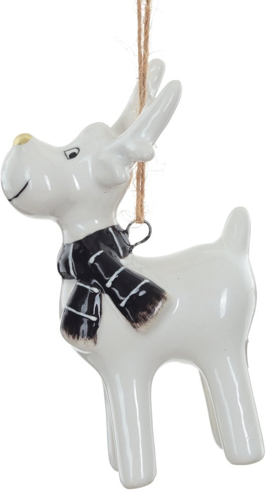 Новогодняя керамическая игрушка в виде веселого оленя станет оригинальным дополнением наряда праздничной елочки. Расписанная в черно-белых тонах подвеска обязательно понравится ценителям необычного декора.