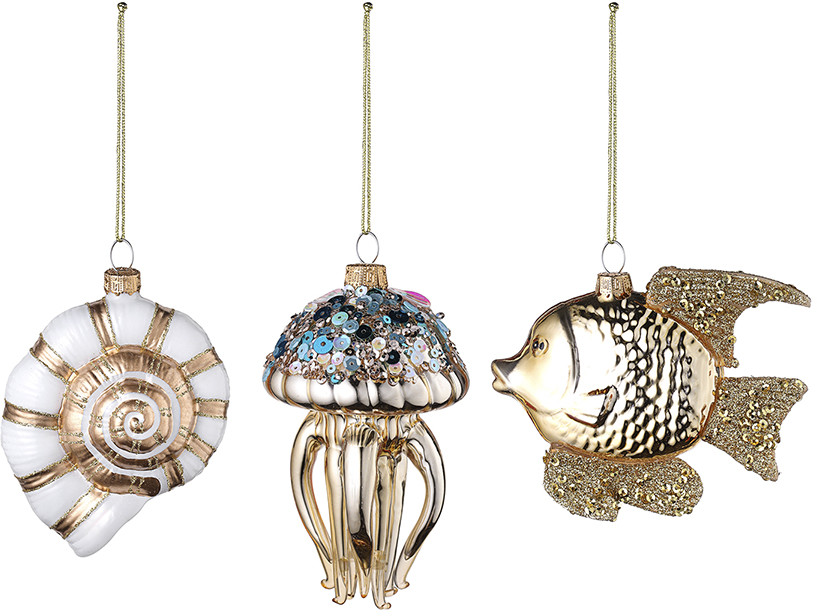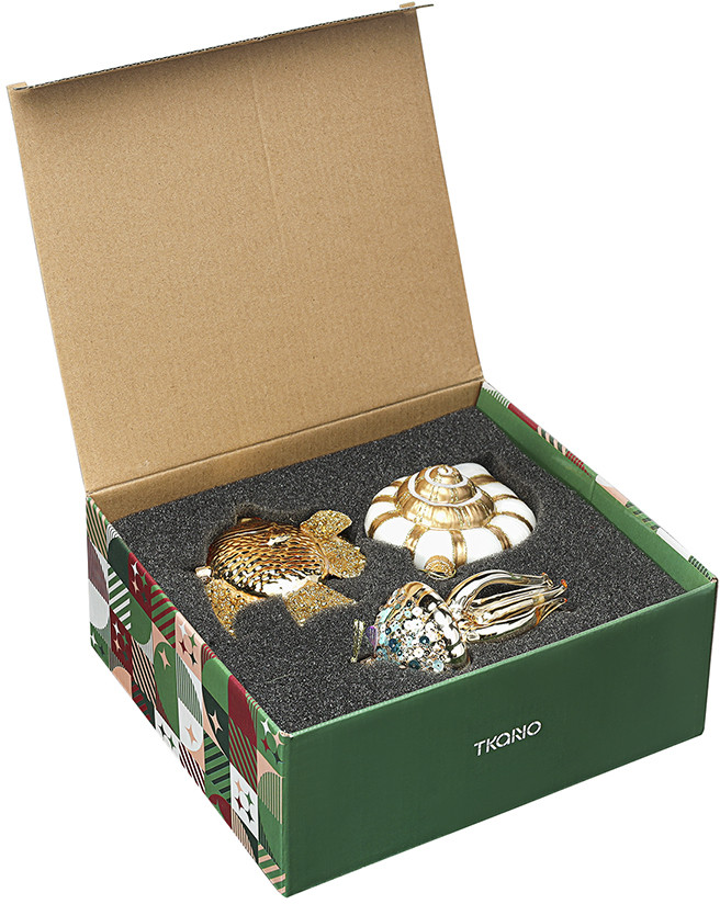 Tkano Набор ёлочных украшений «Sea life»В данный момент этот товар отсутствует в продаже. Возможно, у нас найдется аналогичный или похожий товар здесь. Серия: New Year Essential Набор украшений «Sea Life» из коллекции New Year Essential позволит погрузиться в завораживающий мир океанских глубин. Золотые рыбки, сияющие медузы, перламутровые ракушки преобразят вашу ёлку и помогут создать в доме сказочную атмосферу. Ёлочные игрушки из стекла долговечные и эффектные — красиво блестят и переливаются в свете праздничных огней. Украшения оснащены веревочками, что позволяет легко размещать их на еловых ветках и предметах интерьера. Размеры: 10.7 × 2.8 × 9.3 см; 8.8 × 4.8 × 11.8 см; 6.5 × 6.5 × 11.5 см. |