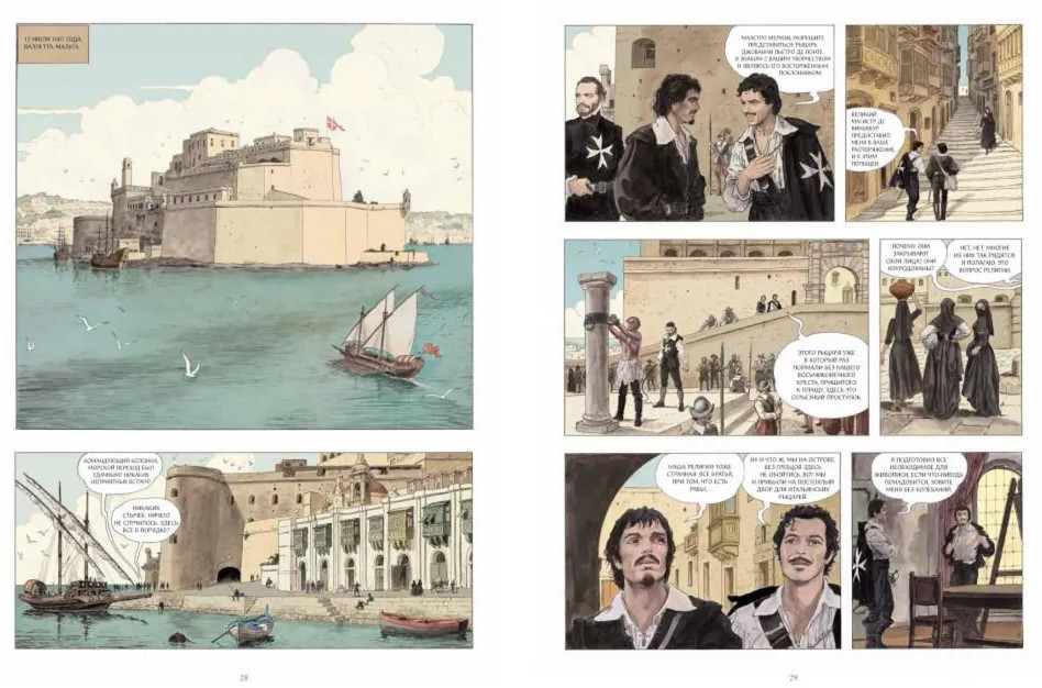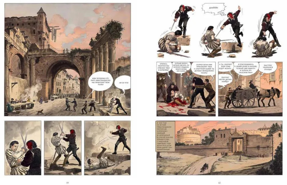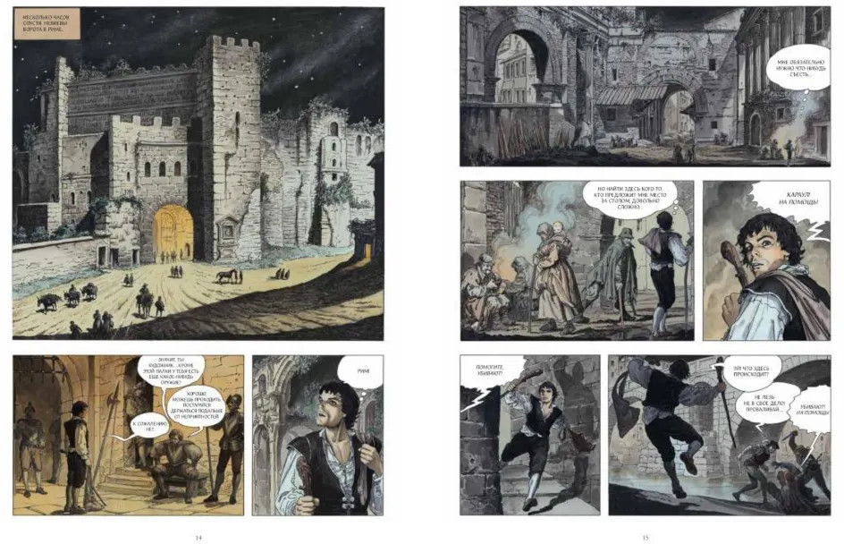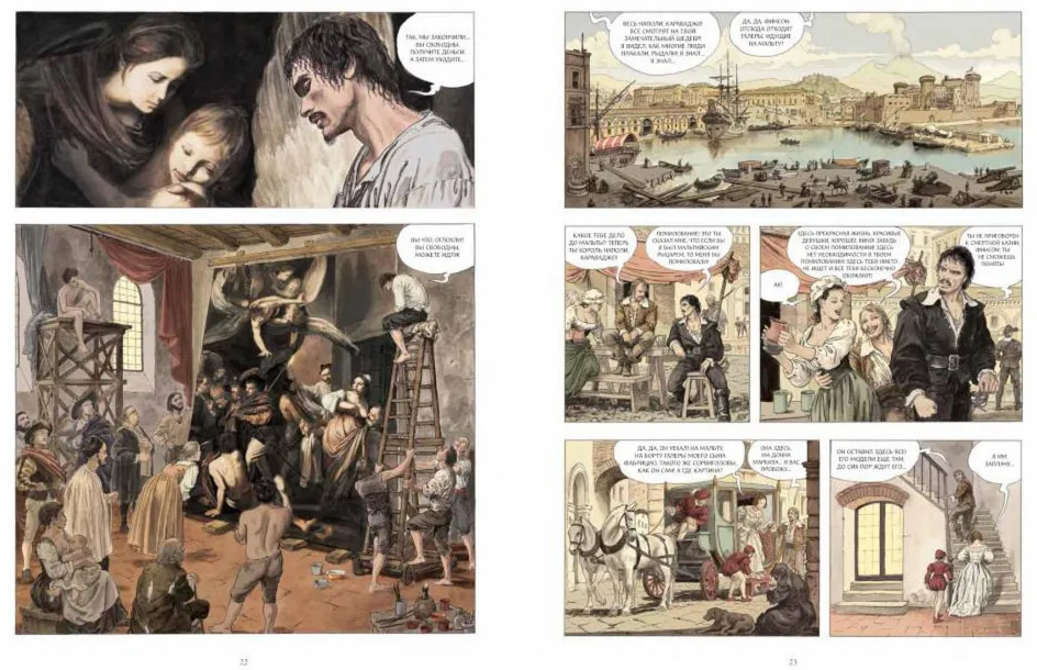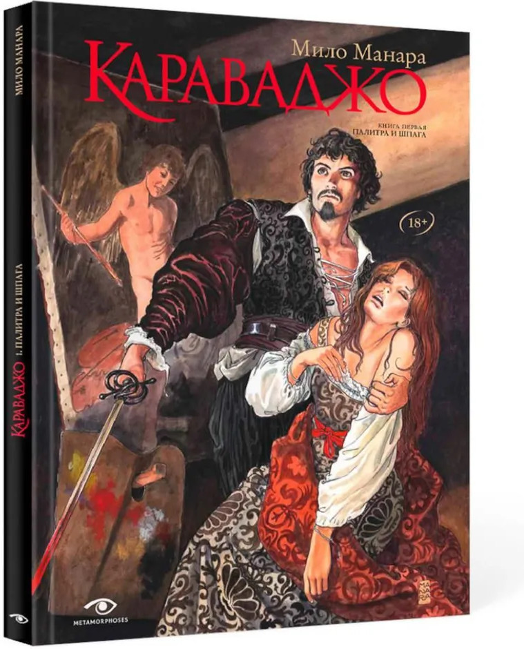 Микеланджело Меризи, известный как Караваджо (1571–1610), вошел в историю как один из величайших художников — тонко чувствующий, стремительный, склонный к риску и гедонизму. Кончик его кисти вырезал свет и тени, создавая незабываемые работы и необыкновенный реализм. Четыре столетия спустя другой итальянский мастер рисования, Мило Манара, отдает дань уважения гению своим графическим романом. Первая книга, «Палитра и шпага», расскажет читателям о радостях и тяготах ранних лет жизни Караваджо в Риме. Вторая книга, «Помилование», показывает художника как фигуру одновременно героическую и трагическую, в то же время не лишенную всего человеческого. Правдоподобность Караваджо не вызывает сомнений, как если бы Манара рассказывал о том, что видел собственными глазами, с безграничным уважением к коллеге, столь далекому по времени, но близкому по чувствительности и творческим намерениям. |