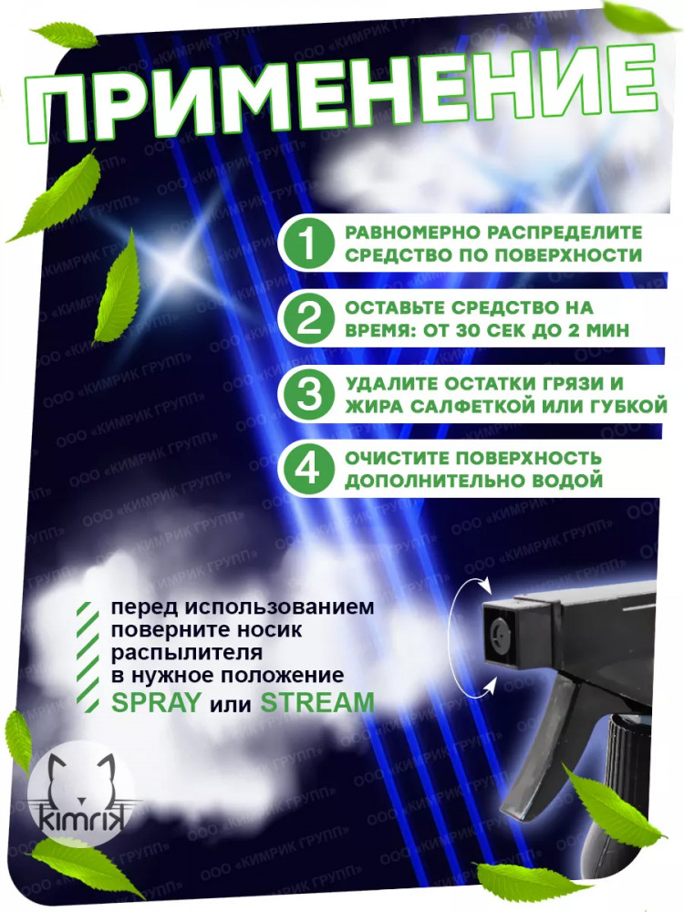Способ применения: наденьте резиновые перчатки, распылите очиститель жира на загрязнённую поверхность, подождите от 30 секунд до 2 минут, удалите загрязнение, смойте водой.