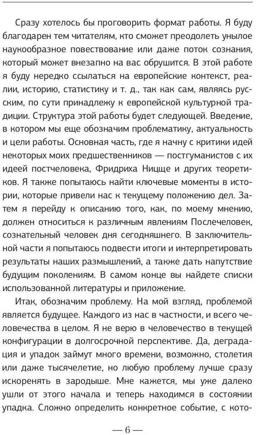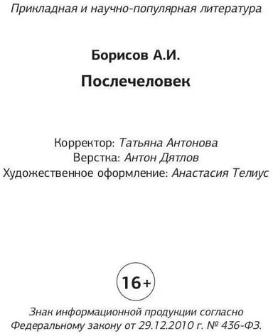 ПослечеловекВ данный момент этот товар отсутствует в продаже. Возможно, у нас найдется аналогичный или похожий товар здесь. Послечеловек — это уникальная философская концепция, погруженная в исторический контекст. Автор рассказывает об исторических событиях, которые сформировали сегодняшнее общество, и формулирует образ человека будущего, который должен привести человечество к новым горизонтам. Книга ищет ответы не только на извечные вопросы, которые мы задаем себе в решающие моменты нашей судьбы, но и на вызовы сегодняшнего дня. Эта книга о прошлом, эта книга о будущем, эта книга о каждом из нас, если мы только осмелимся... |