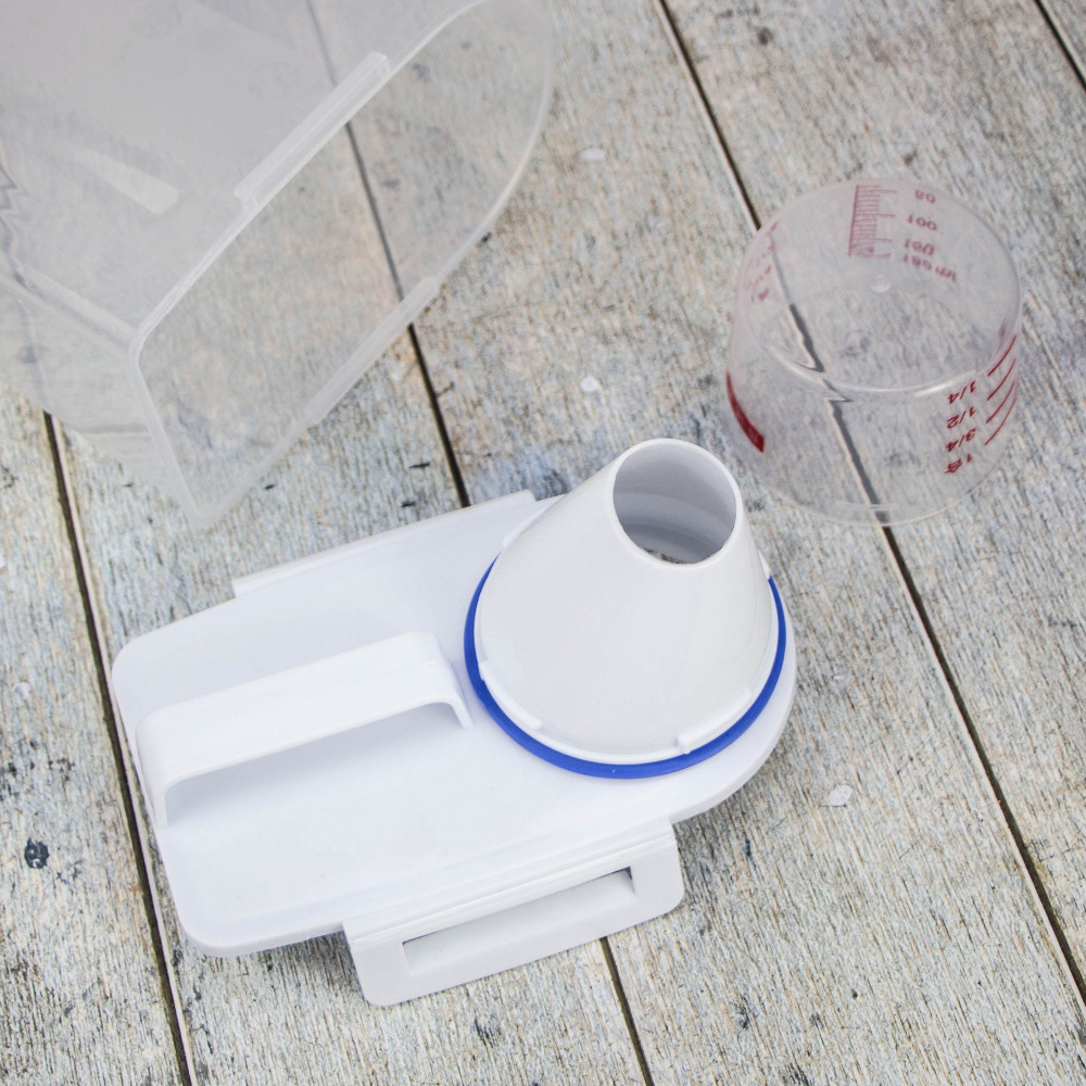 Я бы, конечно, на месте производителя сделала стаканчик тоже с носиком, чтобы удобно было высыпать сухие продукты. Потому что при насыпании в стиральную машинку из мерного стаканчикавсё-таки попадаешь в соседние отсеки.