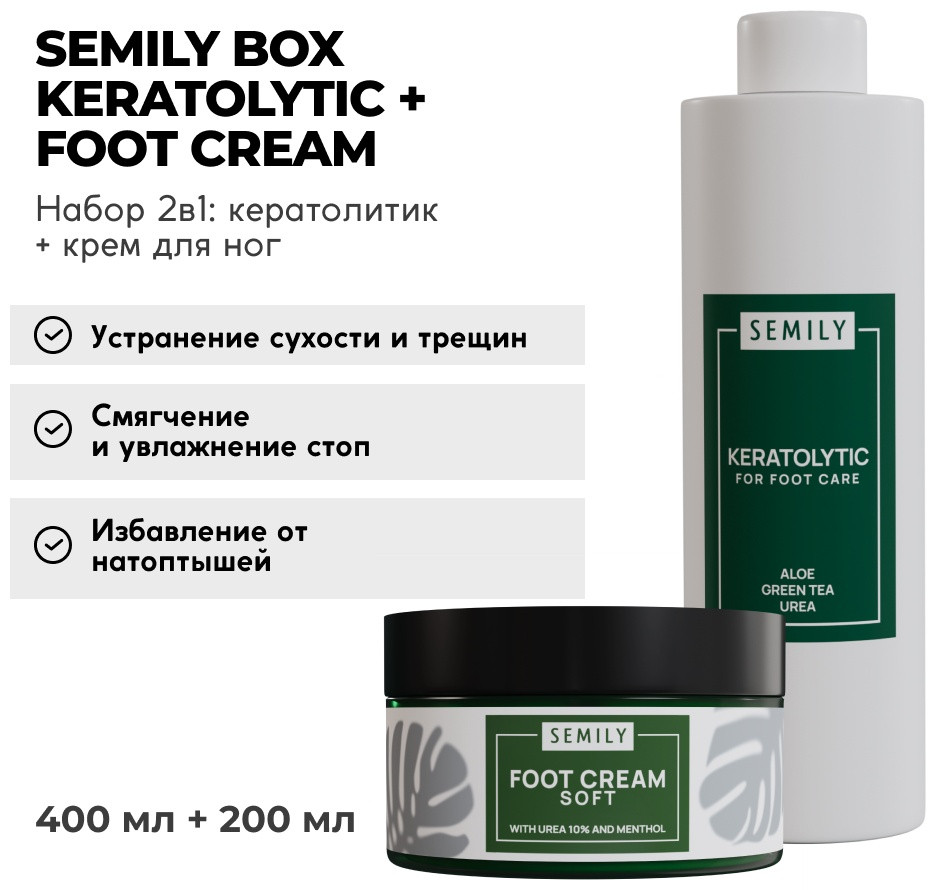 Semily Набор средств для ухода за ногами 2 в 1В данный момент этот товар отсутствует в продаже. Возможно, у нас найдется аналогичный или похожий товар здесь. В набор входят кератолик (400 мл) и крем для ног (200 мл). Профессиональный кератолитик — это эффективное средство для размягчения огрубевшей кожи на пятках, избавляющее от сухих мозолей, трещин и натоптышей. Кератолитик глубоко проникает в ороговевший слой кожи, разрушая связь между чешуйками и позволяя легко удалить омертвевшие клетки. Средство действует быстро, растворяя огрубелости на ступнях за считанные минуты, обновляя и разглаживая кожу. Гель с 20% мочевины для смягчения кожи также увлажняет и препятствует потере влаги. |