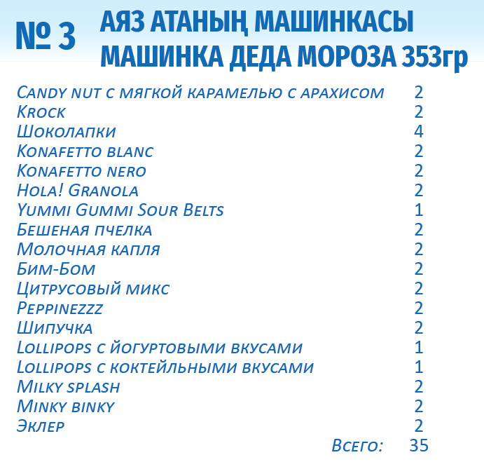 Cахар, патока, масла растительные (полностью гидрогенизированное пальмоядровое, негидрогенизированное пальмовое, негидрогенизированное подсолнечное, негидрогенизированное кокосовое, негидрогенизированное ши), мука пшеничная, глюкозно-фруктозный сироп, продукт молокосодержащий сгущенный (молоко обезжиренное сгущенное, сахар, негидрогенизированное пальмовое масло, лактоза), ядра бобов арахиса жареные, какао-порошок с пониженным содержанием жира, влагоудерживающий агент сорбитовый сироп, сывороточный пермеат сухой (из молока), регуляторы кислотности [кислота молочная, кислота лимонная, кислота яблочная, кислота фумаровая, Е325, Е327, Е331(iii)], молоко сухое обезжиренное, молоко сухое цельное, эмульгаторы [лецитины (содержит сою), Е471], шарики кукурузные (мука кукурузная, сахар, соль), ароматизаторы, глюкоза, сливки молочные сухие, соль, крахмал картофельный, хлопья овсяные, желирующий агент каррагинан, жир молочный, красители [Е100, Е132, Е133, Е150d (содержит сульфиты).