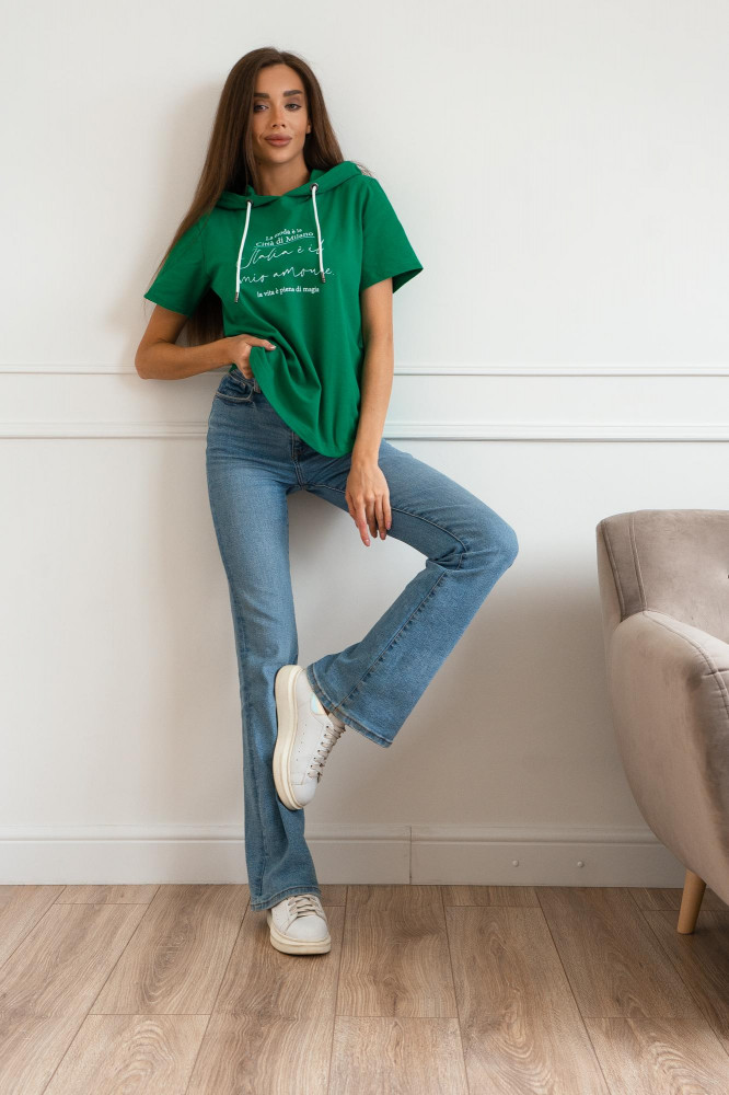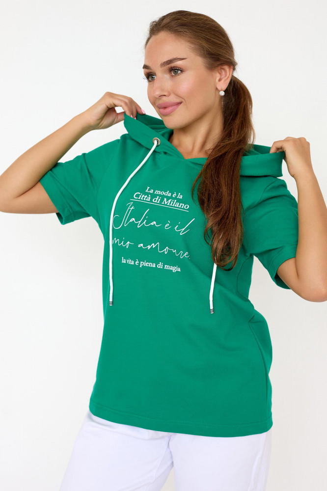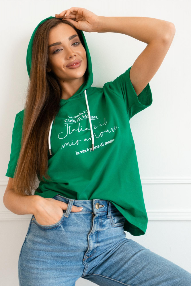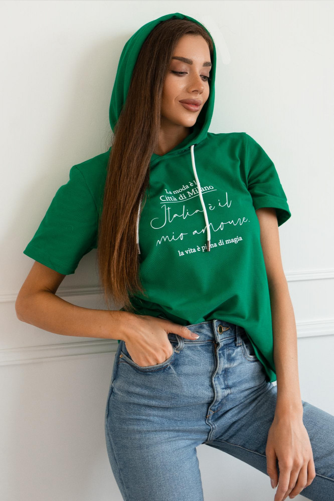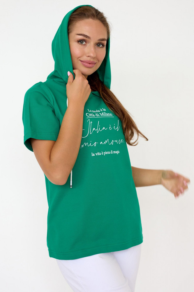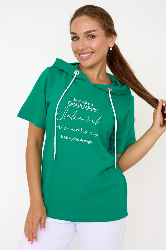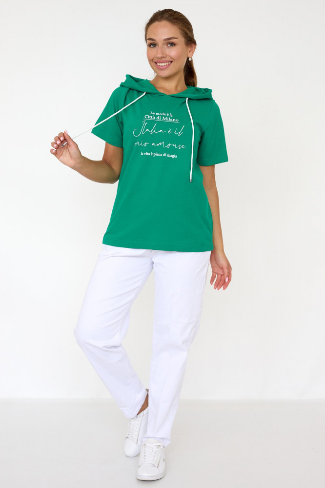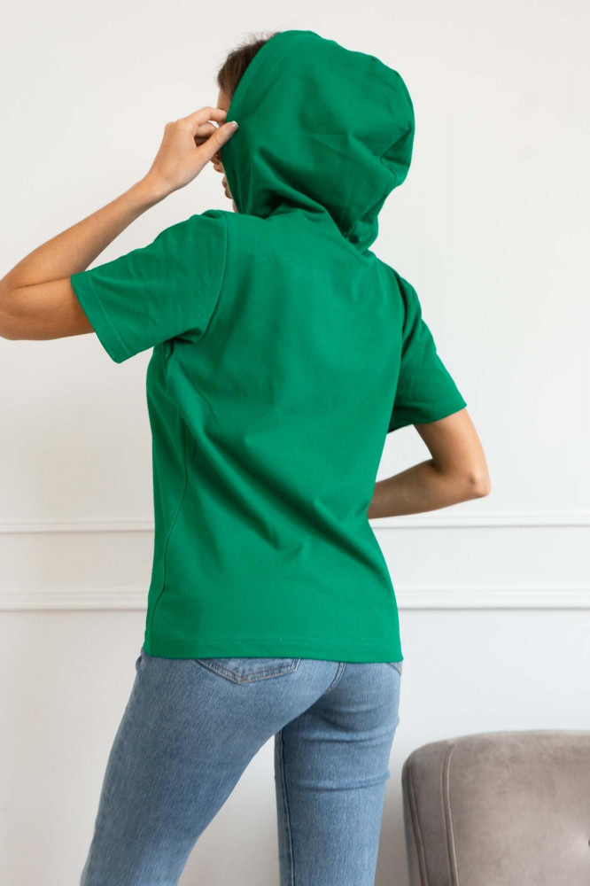 супер футболка! трикотаж приятный 100% хлопок давно такую хотела! чтоб с капюшоном! цвет скорее персиковый-очень красивый! покупкой очень довольна!