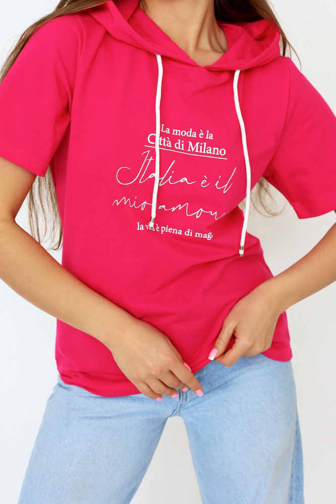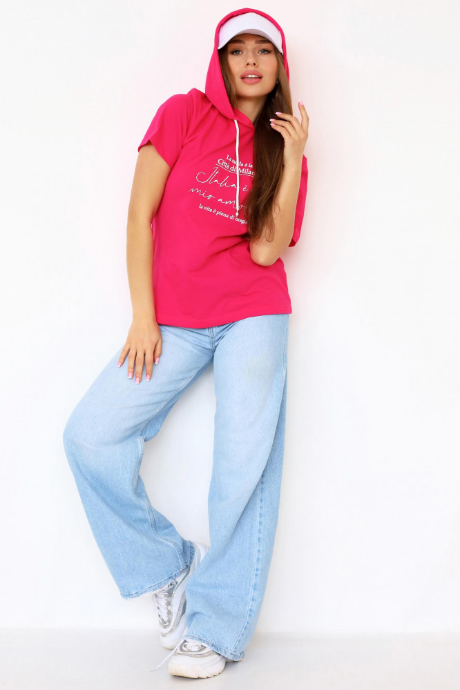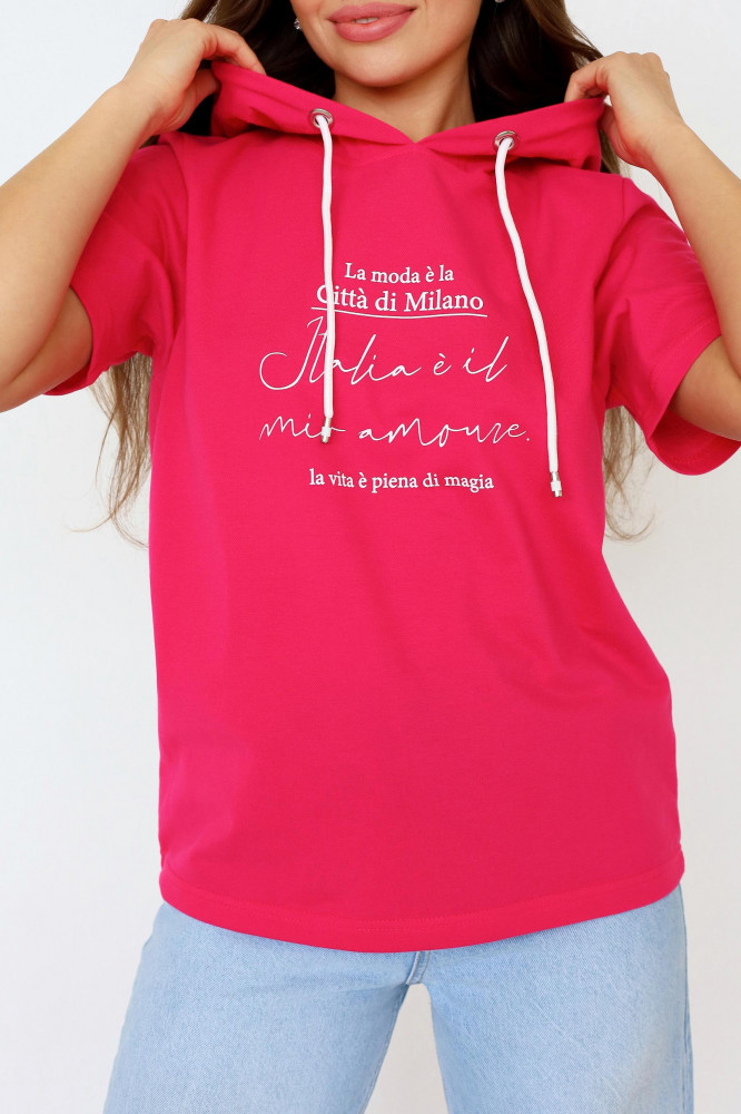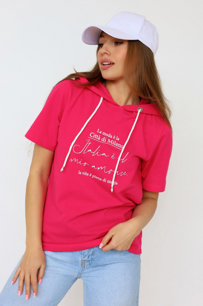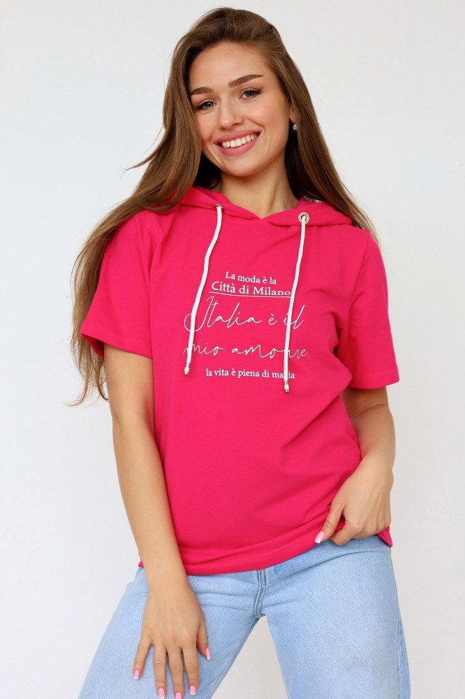 супер футболка! трикотаж приятный 100% хлопок давно такую хотела! чтоб с капюшоном! цвет скорее персиковый-очень красивый! покупкой очень довольна!