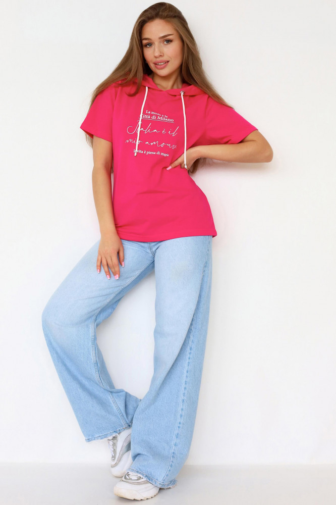 супер футболка! трикотаж приятный 100% хлопок давно такую хотела! чтоб с капюшоном! цвет скорее персиковый-очень красивый! покупкой очень довольна!