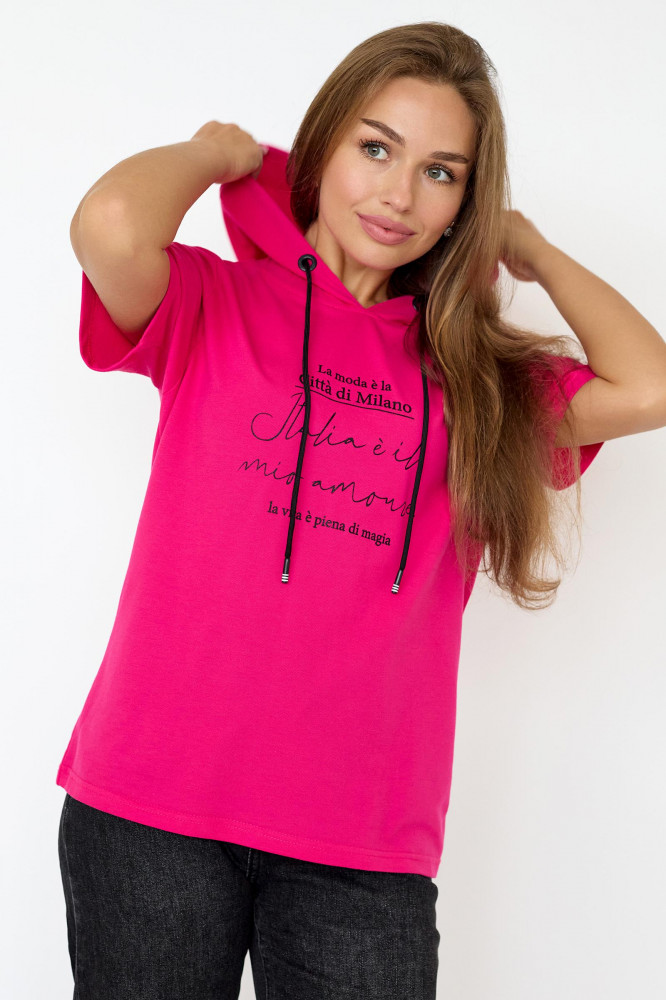 супер футболка! трикотаж приятный 100% хлопок давно такую хотела! чтоб с капюшоном! цвет скорее персиковый-очень красивый! покупкой очень довольна!