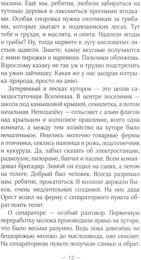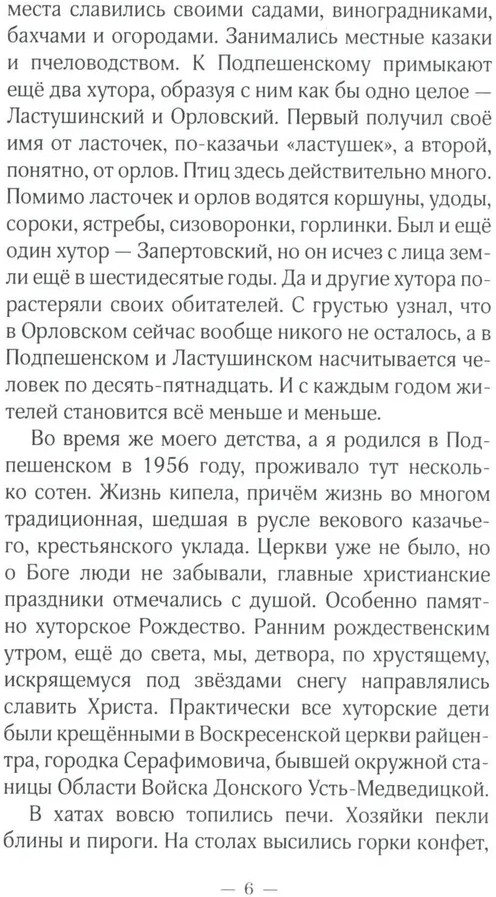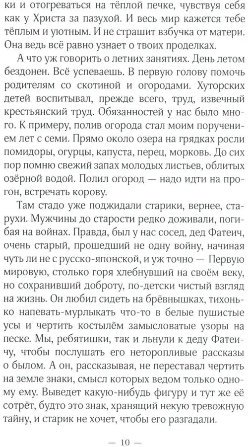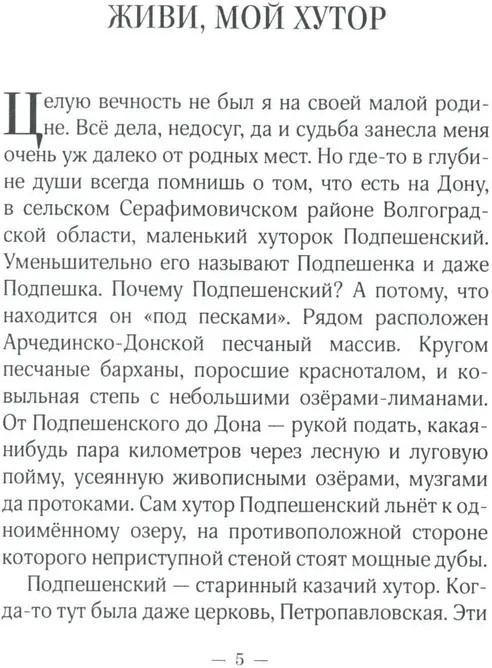 Вниманию читателей предлагается сборник автобиографических рассказов, очерков и эссе, проникнутых любовью автора к своей малой родине — затерянному в песках донскому хутору и его обитателям. На страницах книги оживают картины давней хуторской жизни, протягивается связующая нить к большому миру, к современности. Традиционный крестьянский уклад стал Атлантидой, градом Китежем; он поглощён волнами времени, но автор уверен, что его ценности — вера, справедливость, доброта, трудолюбие — подпитывают нас и сегодня. |