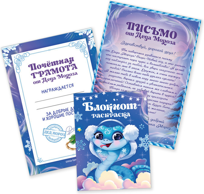 Блокнотик наполовину разукрашена, наполовину страницы для записи, формат А6. Грамота и письмо изготовлены из бумаги как для плакатов, формат А5. В целом, все хорошо