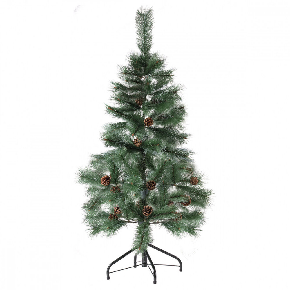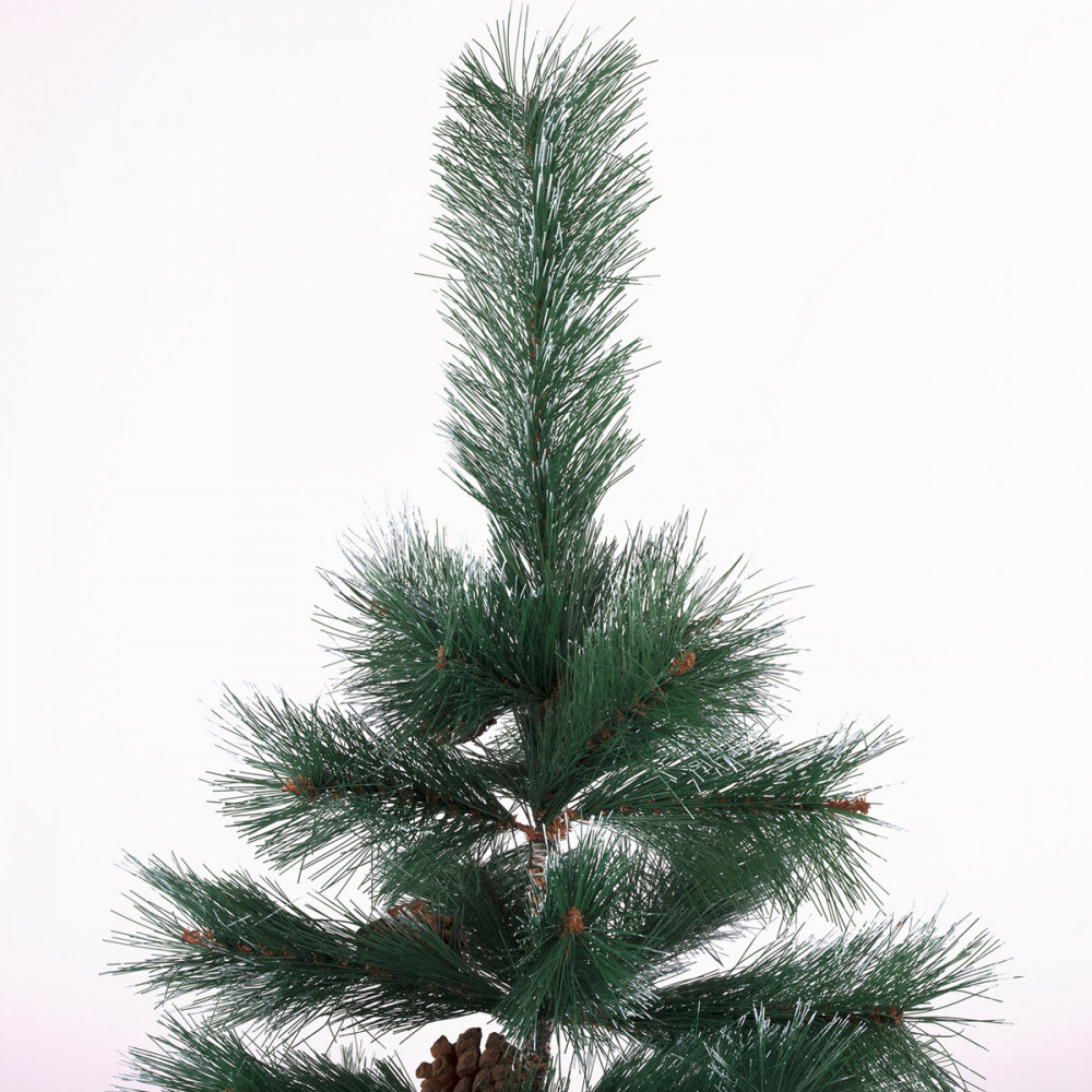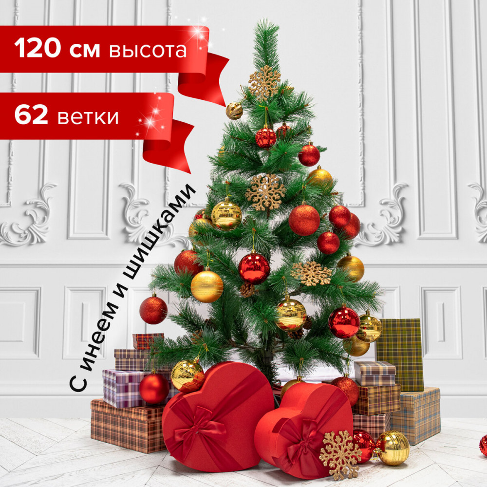 Ель искусственная напольная представляет собой конструкцию из металлического каркаса и закрепляемых на нем ветвей. Материал хвои — ПВХ. Цвет хвои — зеленый. Кончики иголок декорированы «искусственным инеем». Также к ветвям ели прикреплены с помощью проволоки 10 натуральных сосновых шишек. Высота ели — 120 см. Диаметр нижнего яруса — 61 см. Количество веток — 62.