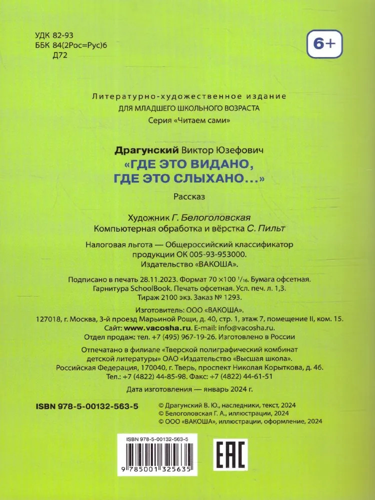 💳 Оплатить за товар можно при получении 🇰🇿 Есть бесплатная доставка по Казахстану от 1 дня 🎁 Копите бонусы с каждой покупки Серия: Читаем сами Очень смешной рассказ Виктора Драгунского из цикла «Денискины рассказы» подходит для самостоятельного чтения. Иллюстрации Геты Белоголовской отражают добрую и весёлую атмосферу рассказа. |