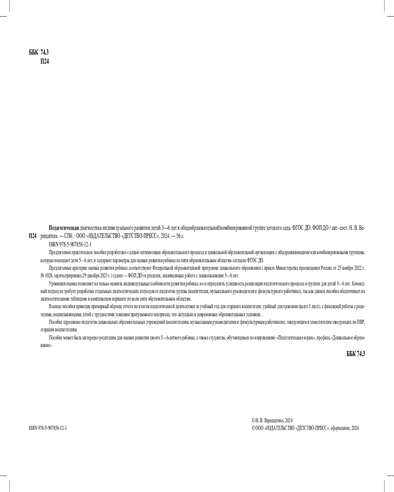💳 Оплатить за товар можно при получении 🇰🇿 Есть бесплатная доставка по Казахстану от 1 дня 🎁 Копите бонусы с каждой покупки Предлагаемое практическое пособие разработано с целью оптимизации образовательного процесса в дошкольной образовательной организации с общеразвивающими или комбинированными группами, которые посещают дети 5–6 лет, и содержит параметры для оценки развития ребенка по пяти образовательным областям согласно ФГОС ДО. Предлагаемые критерии оценки развития ребенка соответствуют Федеральной образовательной программе дошкольного образования (далее — ФОП ДО) в разделах, посвященных работе с дошкольниками 5–6 лет. Уровневая оценка позволяет не только оценить индивидуальные особенности развития ребенка, но и определить успешность реализации педагогического процесса в группах для детей 5–6 лет. Командный подход не требует разработки отдельных диагностических подходов от педагогов группы (воспитателя, музыкального руководителя и физкультурного работника), так как данное пособие обеспечивает их диагностическими таблицами в комплексном варианте по всем пяти образовательным областям. |