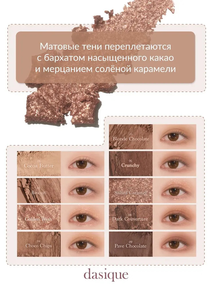 Choco Chips: Mica (CI 77019), Talc, Titanium Dioxide (CI 77891), Calcium Aluminum Borosilicate, Nylon-12, Silica, Magnesium Myristate, Neopentyl Glycol Diethylhexanoate, Phenyl Trimethicone, Iron Oxides (CI 77491), Calcium Sodium Borosilicate, Silver (CI 77820), Iron Oxides (CI 77492), Dipentaerythrityl Hexahydroxystearate/Hexastearate/Hexarosinate, Dimethicone, Magnesium Stearate, Methylpropanediol, Diisostearyl Malate, Isostearyl Neopentanoate, Octyldodecyl Stearoyl Stearate, Macadamia Ternifolia Seed Oil, Iron Oxides (CI 77499), Dimethicone/Vinyl Dimethicone Crosspolymer, Propanediol, Polybutene, Yellow 5 Lake (CI 19140), Lauroyl Lysine, Triethoxycaprylylsilane, Aluminum Hydroxide, Hydrogenated Lecithin, Methicone, Red 30 (CI 73360), Tin Oxide (CI 77861), Water.