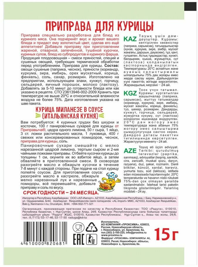 💳 Оплатить за товар можно при получении 🇰🇿 Есть бесплатная доставка по Казахстану от 1 дня 🎁 Копите бонусы с каждой покупки Представляем вашему вниманию высококачественную приправу для курицы от бренда Приправыч. Эта сухая смесь разработана специально для того, чтобы сделать ваши блюда из курицы ещё более вкусными и ароматными. Сочетание тщательно подобранных специй и приправ позволяет раскрыть все аспекты нежного вкуса куриного мяса. Приправа для курицы идеально подходит как для запекания, так и для жарки. Она придаёт блюдам насыщенный и аппетитный аромат, который оценят ваши близкие и друзья. Используйте специи и приправы для курицы, чтобы создать кулинарные шедевры на своей кухне. В каждой упаковке содержится 15 граммов этой уникальной смеси, что делает её удобной для использования и хранения. |