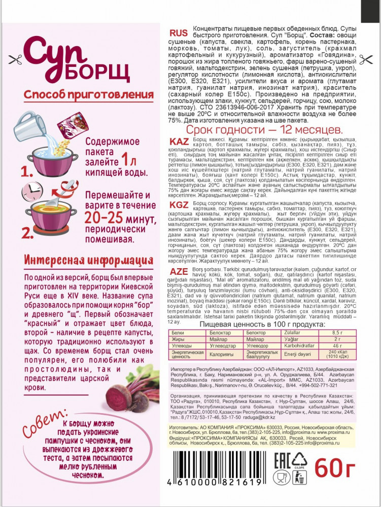 | Компания «Проксима» — это деятельность, направленная на маркетинговые исследования и производство продуктов питания, помогающая людям подчеркивать вкус любимых кушаний, получать новые впечатления и удовольствие от приготовления блюд по новым рецептам, знакомиться с традициями, культурой, и великолепной кухней разных народов мира. Компания «Проксима» сегодня одна из крупнейших компаний по объемам производства и продаж на рынке приправ, специй, супов быстрого приготовления, пряностей и... |