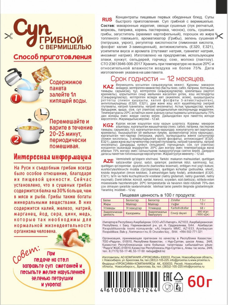 | Компания «Проксима» — это деятельность, направленная на маркетинговые исследования и производство продуктов питания, помогающая людям подчеркивать вкус любимых кушаний, получать новые впечатления и удовольствие от приготовления блюд по новым рецептам, знакомиться с традициями, культурой, и великолепной кухней разных народов мира. Компания «Проксима» сегодня одна из крупнейших компаний по объемам производства и продаж на рынке приправ, специй, супов быстрого приготовления, пряностей и... |