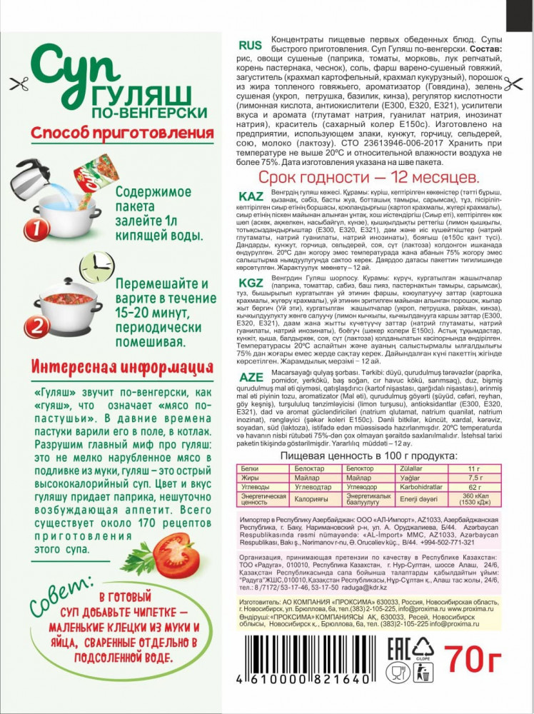 | Компания «Проксима» — это деятельность, направленная на маркетинговые исследования и производство продуктов питания, помогающая людям подчеркивать вкус любимых кушаний, получать новые впечатления и удовольствие от приготовления блюд по новым рецептам, знакомиться с традициями, культурой, и великолепной кухней разных народов мира. Компания «Проксима» сегодня одна из крупнейших компаний по объемам производства и продаж на рынке приправ, специй, супов быстрого приготовления, пряностей и... |
