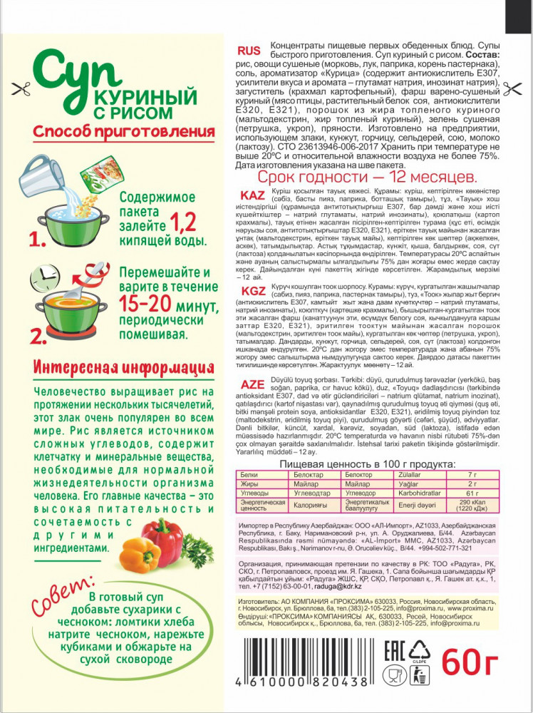 | Компания «Проксима» — это деятельность, направленная на маркетинговые исследования и производство продуктов питания, помогающая людям подчеркивать вкус любимых кушаний, получать новые впечатления и удовольствие от приготовления блюд по новым рецептам, знакомиться с традициями, культурой, и великолепной кухней разных народов мира. Компания «Проксима» сегодня одна из крупнейших компаний по объемам производства и продаж на рынке приправ, специй, супов быстрого приготовления, пряностей и... |