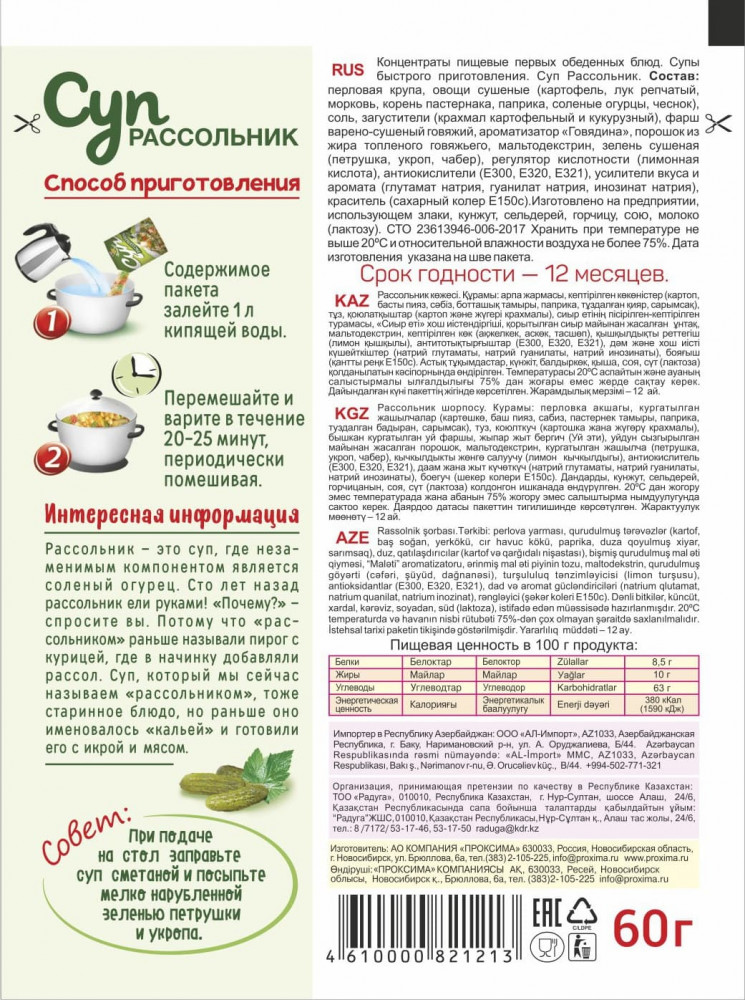 | Компания «Проксима» — это деятельность, направленная на маркетинговые исследования и производство продуктов питания, помогающая людям подчеркивать вкус любимых кушаний, получать новые впечатления и удовольствие от приготовления блюд по новым рецептам, знакомиться с традициями, культурой, и великолепной кухней разных народов мира. Компания «Проксима» сегодня одна из крупнейших компаний по объемам производства и продаж на рынке приправ, специй, супов быстрого приготовления, пряностей и... |
