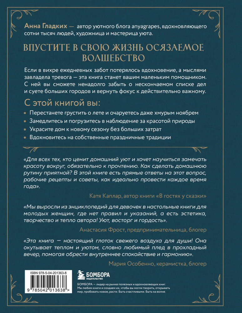 💳 Оплатить за товар можно при получении 🇰🇿 Есть бесплатная доставка по Казахстану от 1 дня 🎁 Копите бонусы с каждой покупки Серия: Хюгге. Уютные книги о счастье Аня Гладких — автор уютного блога anyagrapes, вдохновляющего сотни тысяч людей, художница и мастерица уюта. |