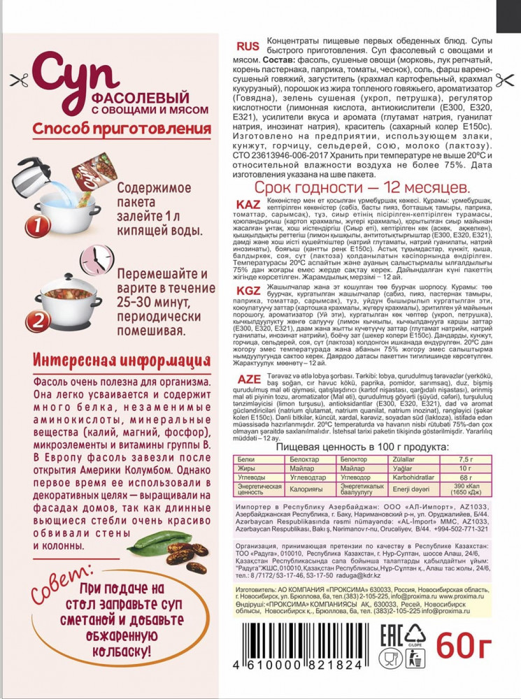 | Компания «Проксима» — это деятельность, направленная на маркетинговые исследования и производство продуктов питания, помогающая людям подчеркивать вкус любимых кушаний, получать новые впечатления и удовольствие от приготовления блюд по новым рецептам, знакомиться с традициями, культурой, и великолепной кухней разных народов мира. Компания «Проксима» сегодня одна из крупнейших компаний по объемам производства и продаж на рынке приправ, специй, супов быстрого приготовления, пряностей и... |